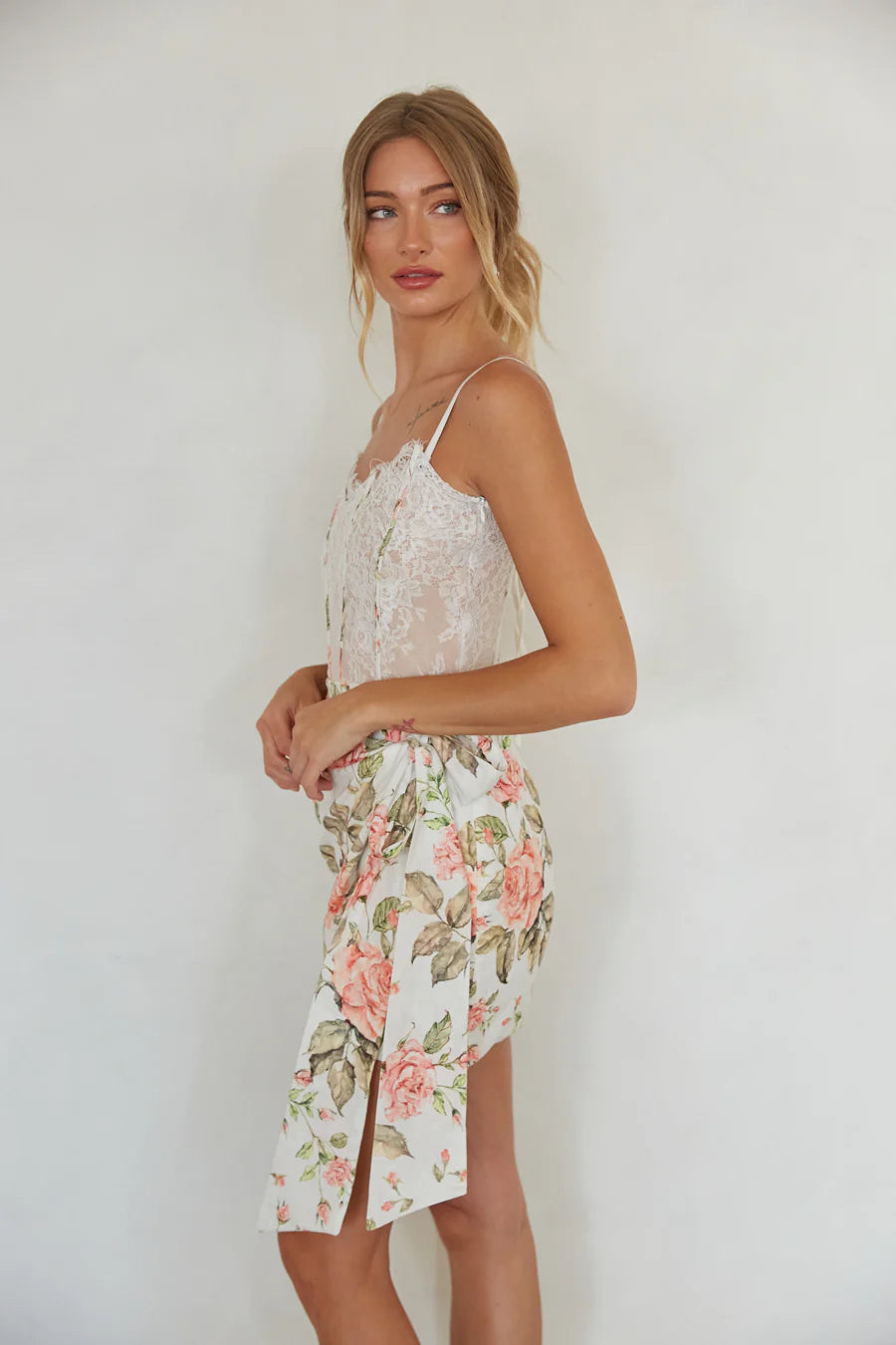 The Mariah Floral Lace Corset Mini Dress is Tea Party worthy. This floral mini dress features a white lace corset bodice, tie wrap skirt, and lace up back. Pair this mini dress with to complete the look.