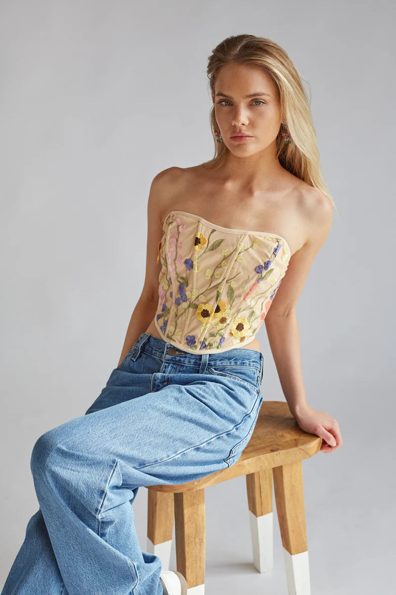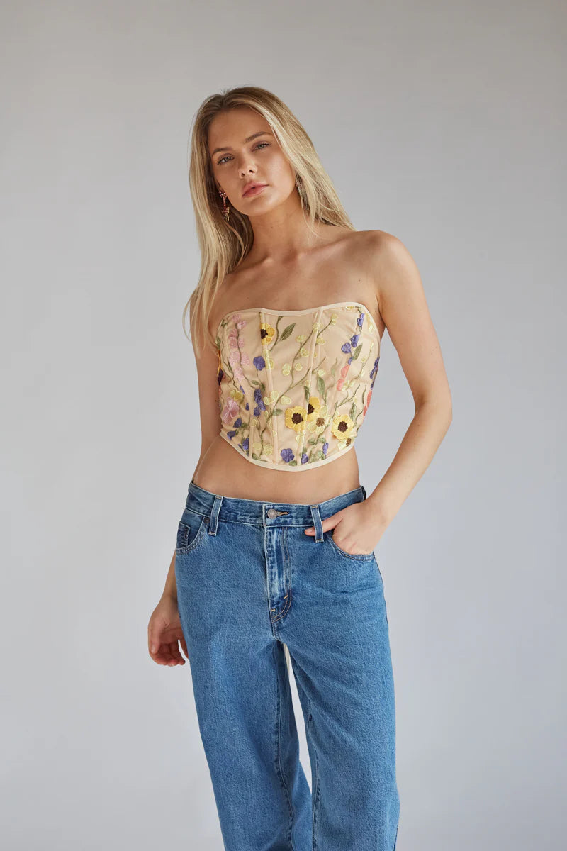 Get ready for spring in the Marigold Strapless Floral Lace Corset Top! This beautiful top features a feminine floral embroidered lace overlay, a strapless neckline, lace up ribbon back with silver grommets, and a curved hem. Pair with some to complete the look!