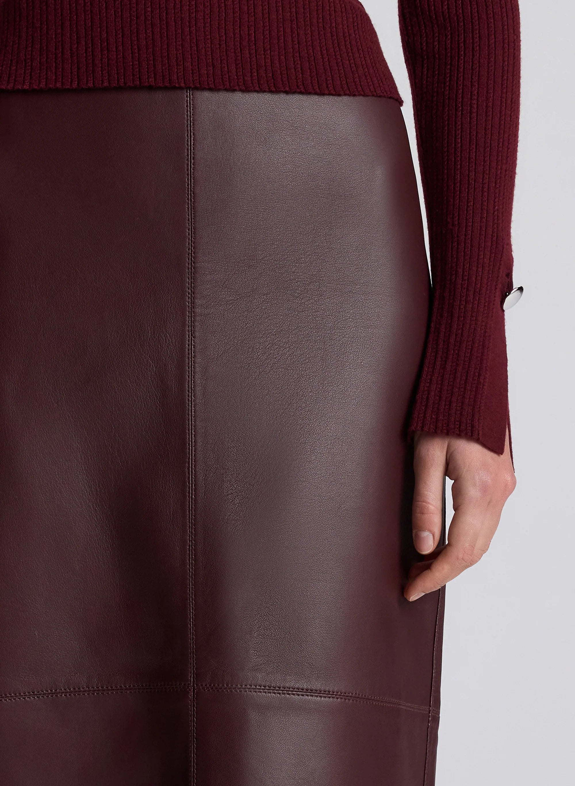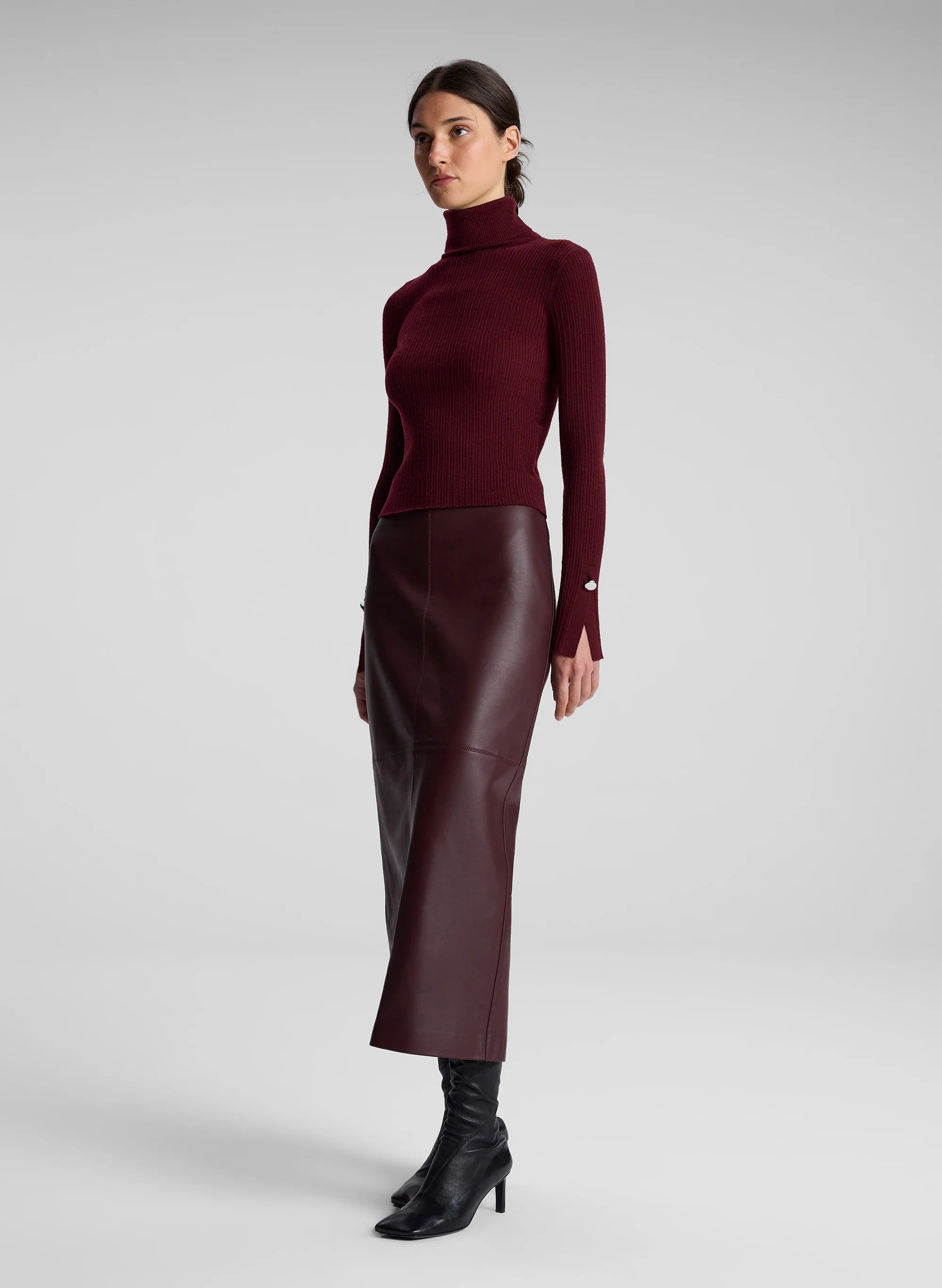 The Marta Skirt is crafted from 100% soft lamb leather in an umber hue. This long midi silhouette falls straight from hip to hem and features both a slit and zip closure in the back. Shop Bottoms.