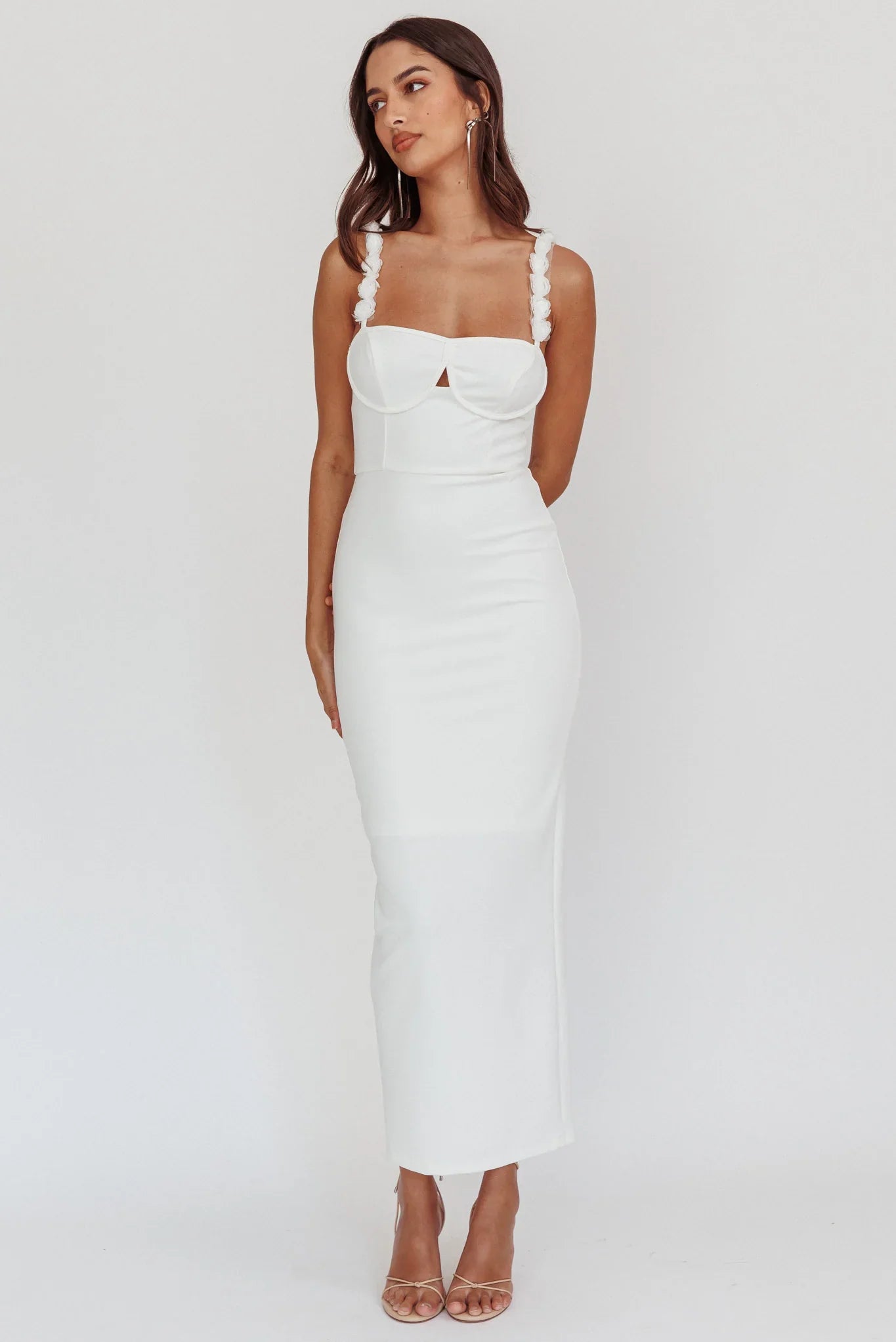 Turn heads in our gorgeous Marteen midi dress. It features the sweetest rosettes on the straps and bodycon silhouette. It's perfect for bridal events or a romantic anniversary dinner. Team it with strappy, nude tie-up heels and a clutch for an unforgettable look.