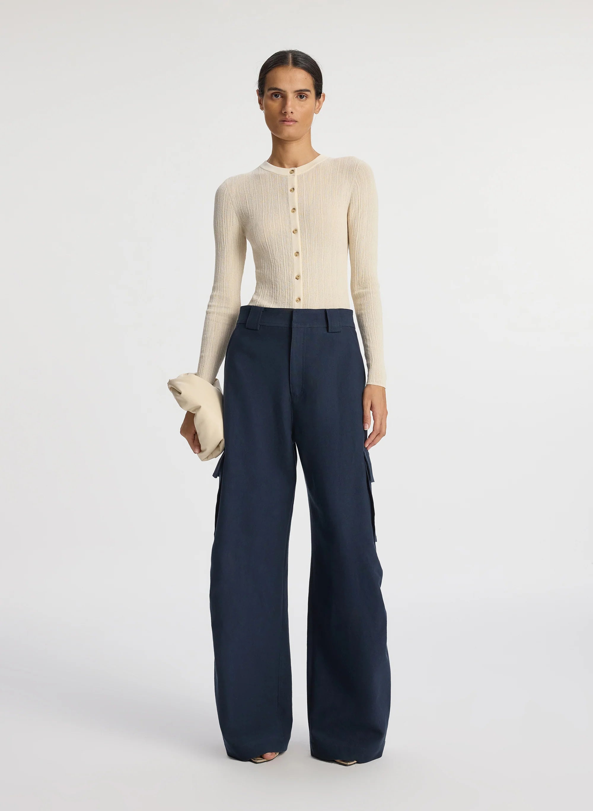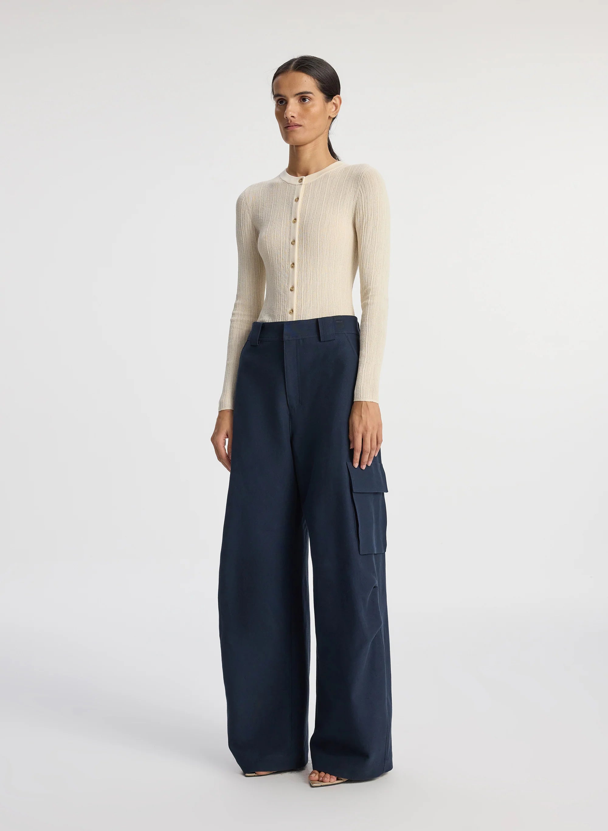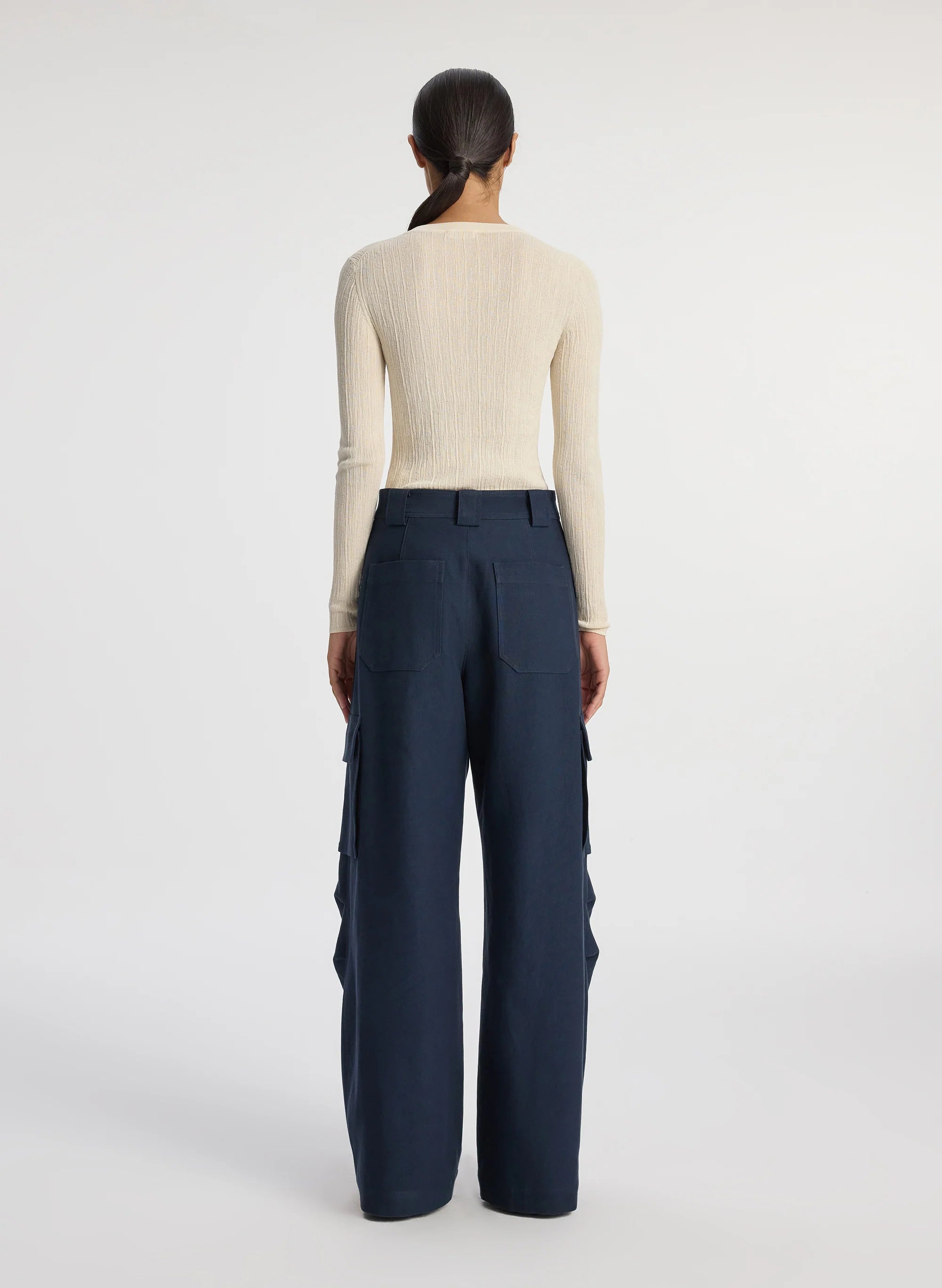 The Megan Pant is crafted from our structured blend of viscose cotton fabric in timeless navy. This mid-rise silhouette is a modern fusion of classic tailoring and utilitarian design. featuring roomy wide legs with large front cargo pockets and back patch pockets. Shop Bottoms