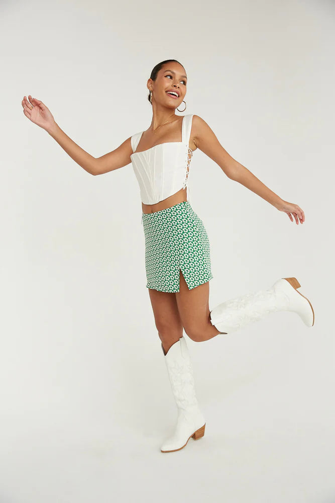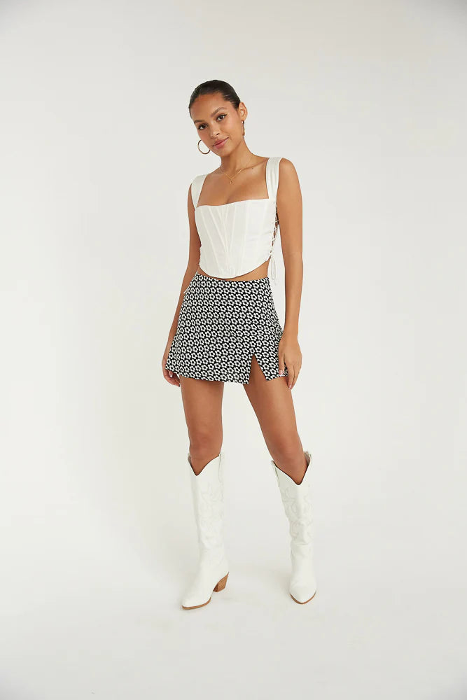 Fun & flirty in the Memphis High-Rise Side Slit Floral Mini Skirt! Featuring a high rise fit, a white flower design, a side slit detail, and built in shorts for a comfy fit. Available in green and black. Pair this top with the to complete the look.