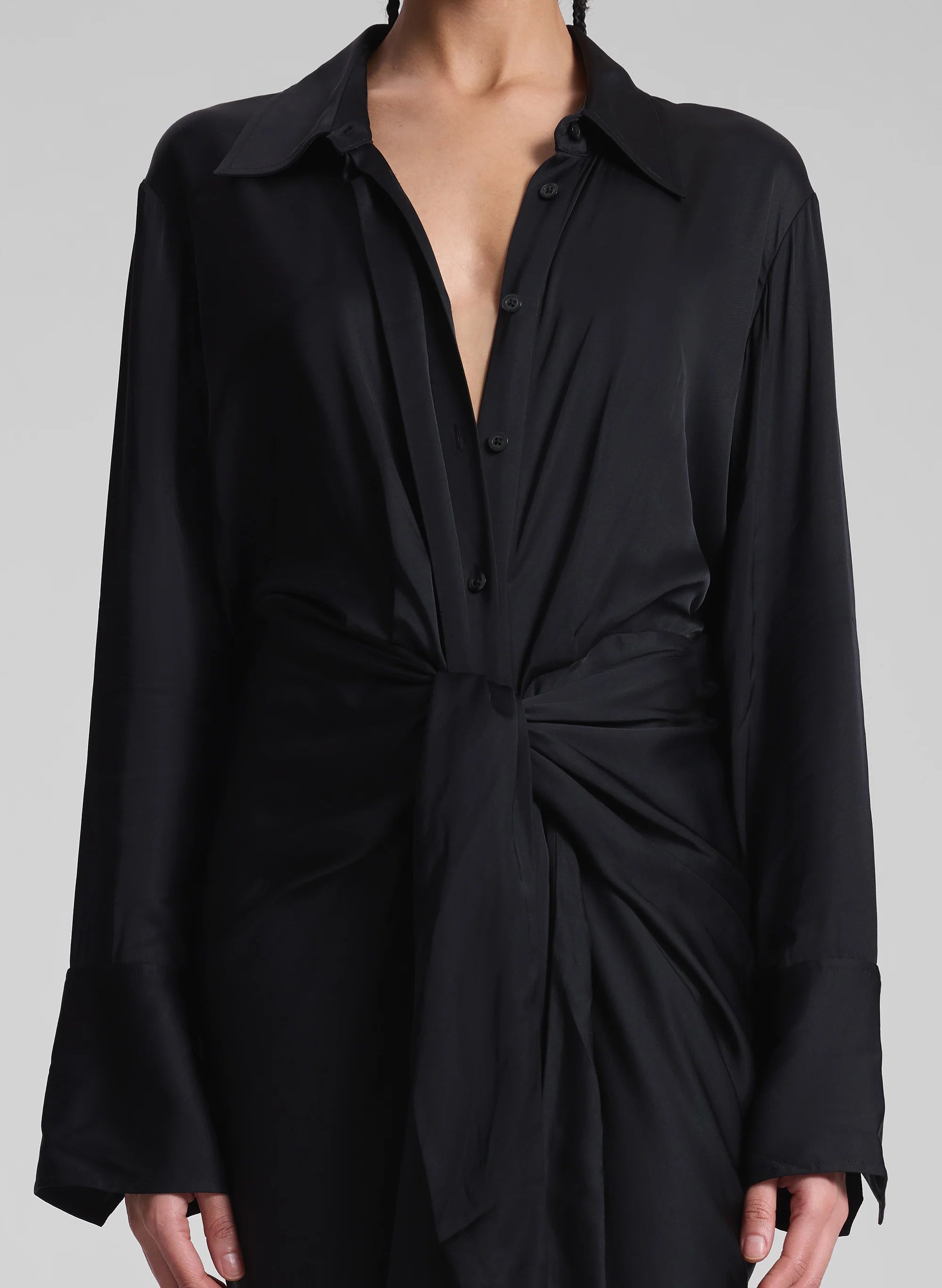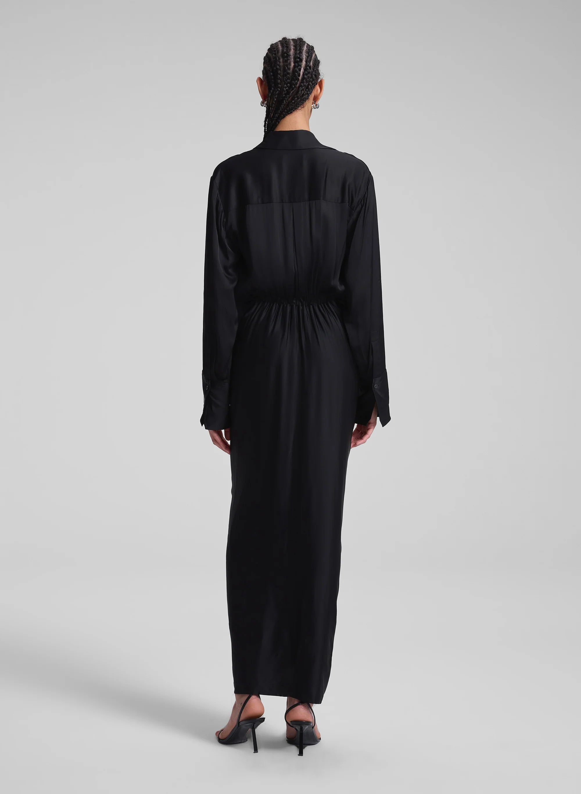 The Mila Dress is woven from a lustrous black satin with captivating fluidity. . This long-sleeve maxi silhouette features elegant wrap-tie detailing at the waist and knuckle-grazing sleeves. offering a refined take on classic shirt dressing. Shop Dresses.