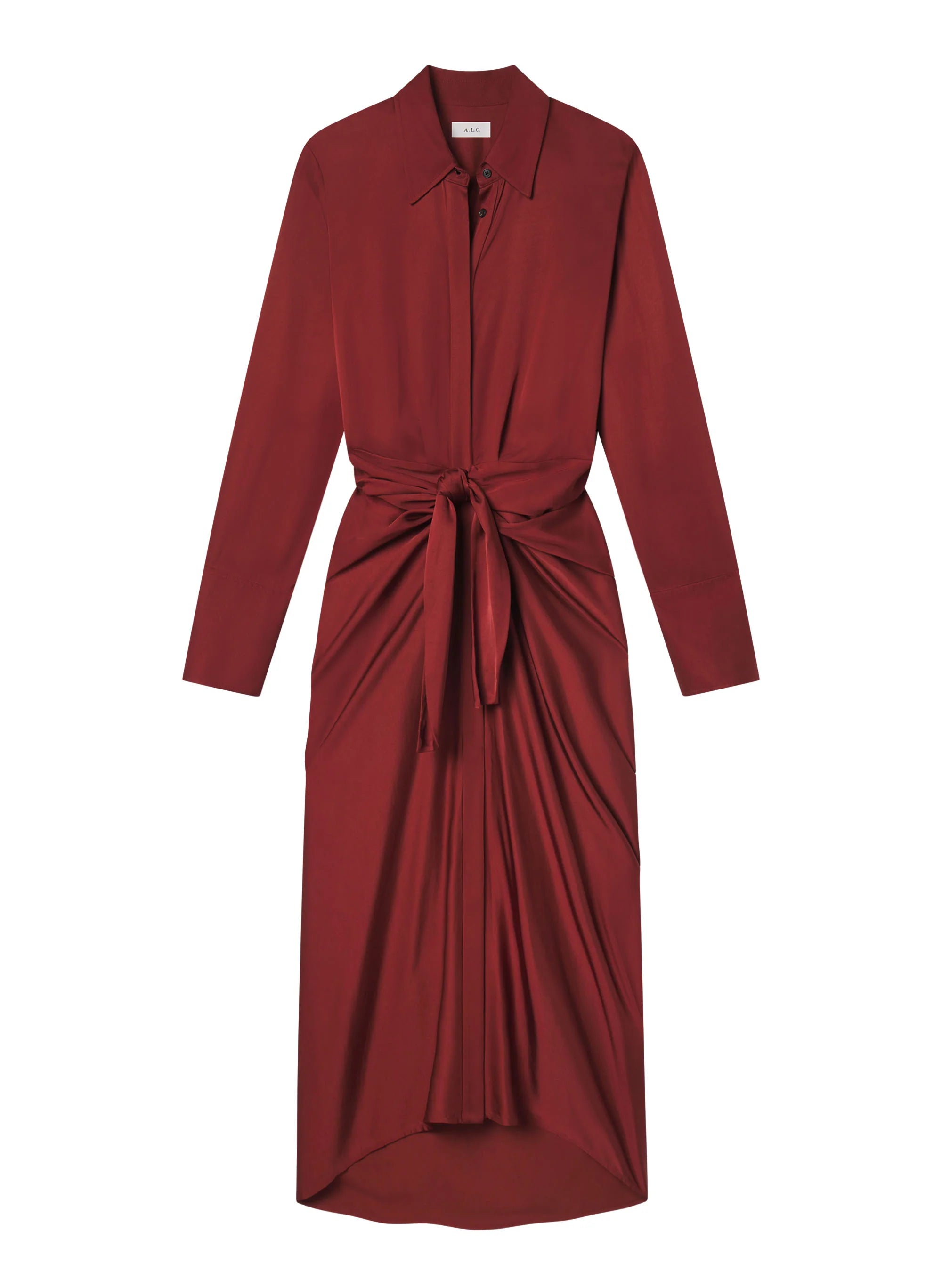 The Mila Dress is woven from our fluid viscose fabric in a bosco hue. This long-sleeve maxi silhouette features elegant wrap-tie detailing at the waist and knuckle-grazing sleeves for a refined take on classic shirt dressing. This style runs true to size. Shop Dresses.