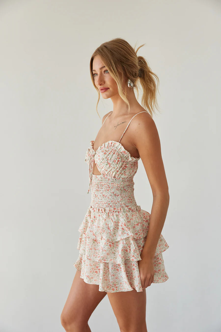 Ready, set, bloom in the Mirabelle Floral Keyhole Cutout Romper this Summer! This dress romper features a flattering smocked waist, flirty keyhole cutout, and flouncy tiered ruffle skirt! to polish off the outift!