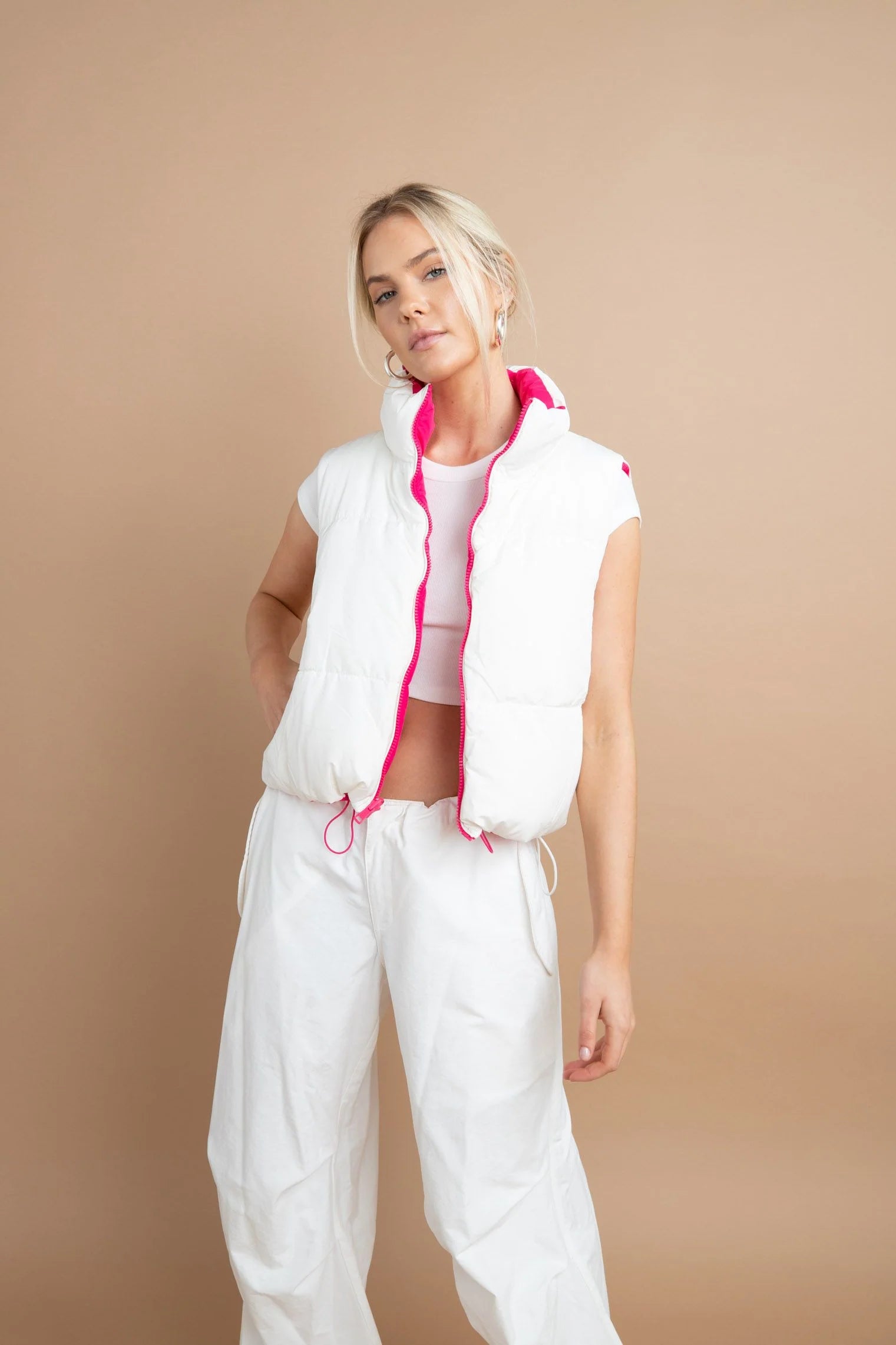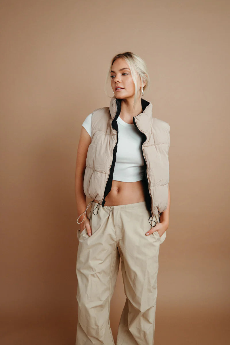 Keep your winter looks on-trend with the Morgan Reversible Puffer Vest! This trendy vest features a mock neckline, cropped fit, cinched hem, and a sleeveless bodice with a front zipper. Available in reversible black & beige, green & beige, and pink & white. Complete this streetwear look with the !