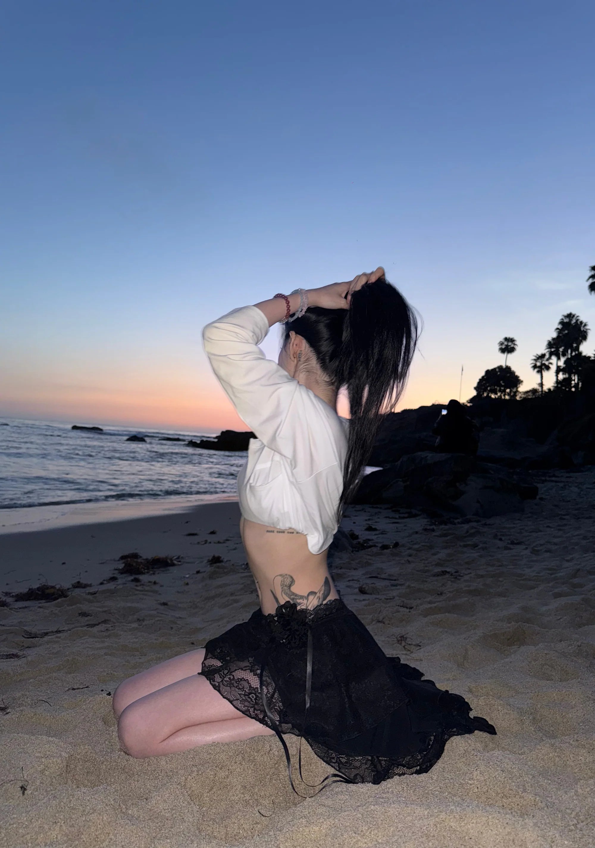 This midi skirt has a mesh and floral lace construction,an asymmetrical layered design, decorative floral applique on the side, a lettuce trimmed hem, and an elastic waistband.
