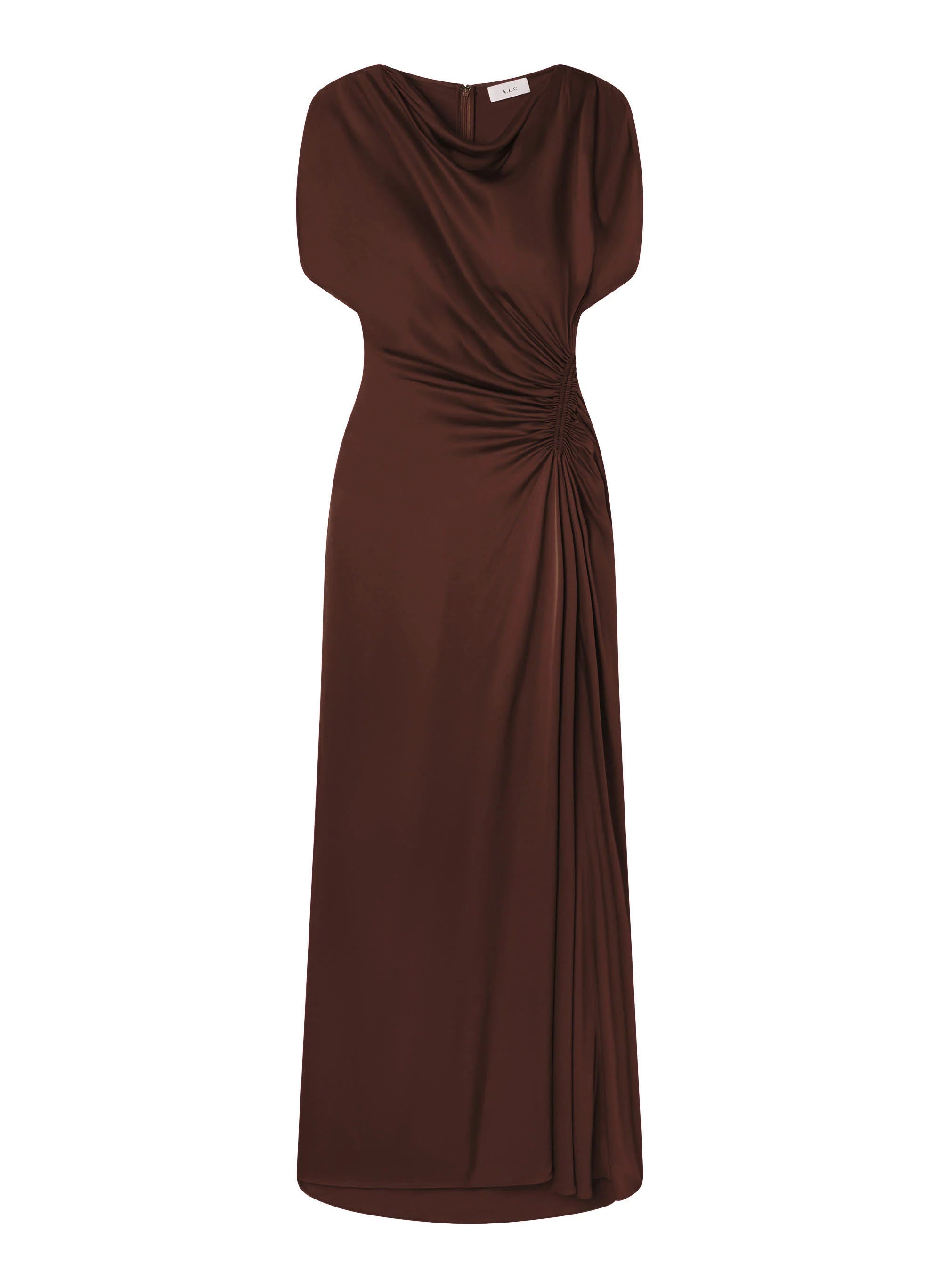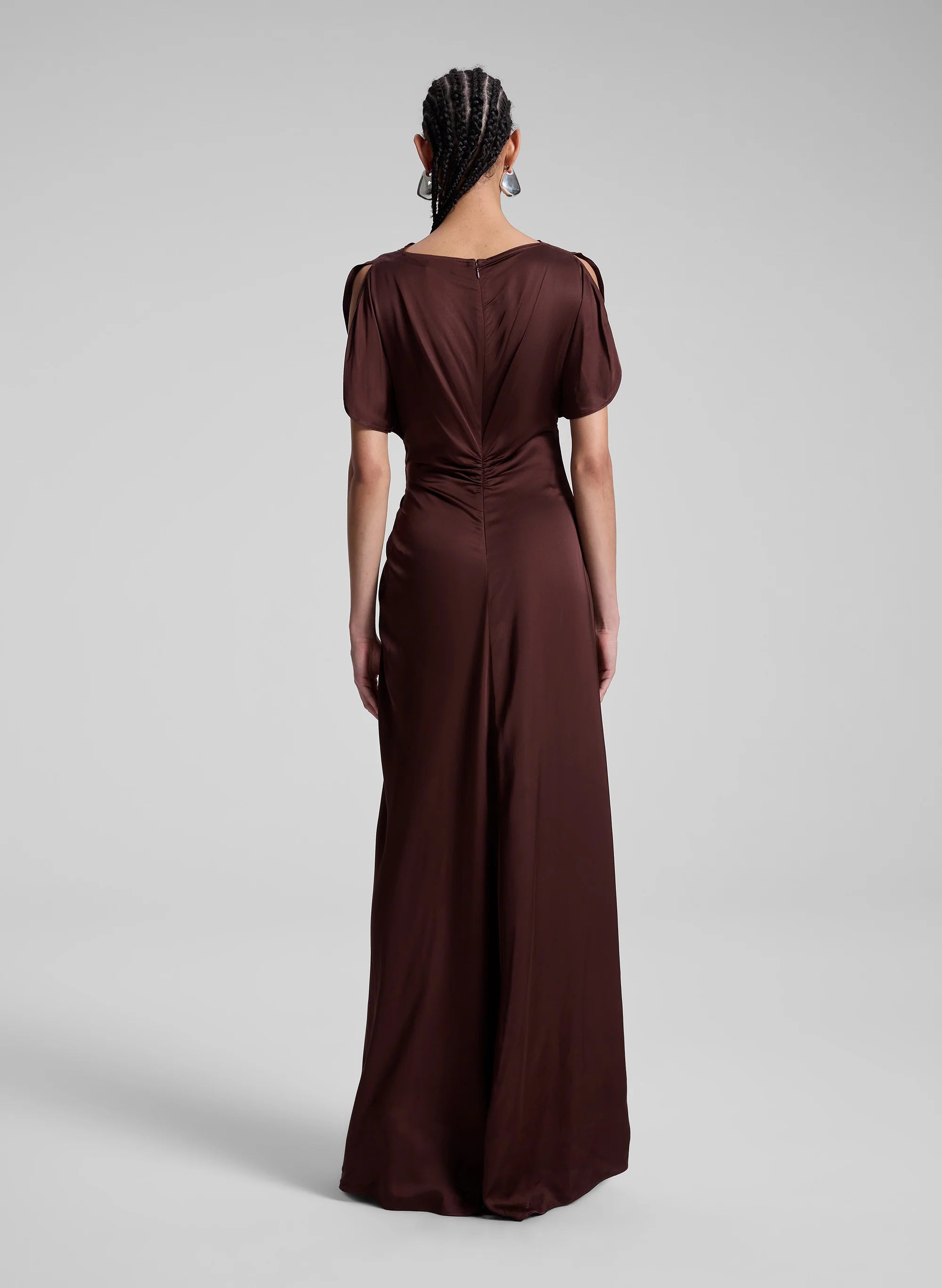 The Nadia Gown is crafted from our fluid satin fabric in a rich chocolate plum hue. This full-length silhouette features an elegantly draped cowl neckline and short sleeves with slits for added movement. Gathering along the curved seam through the hip creates another focal point. flowing into a draped hemline with beautiful movement. Shop Dresses.
