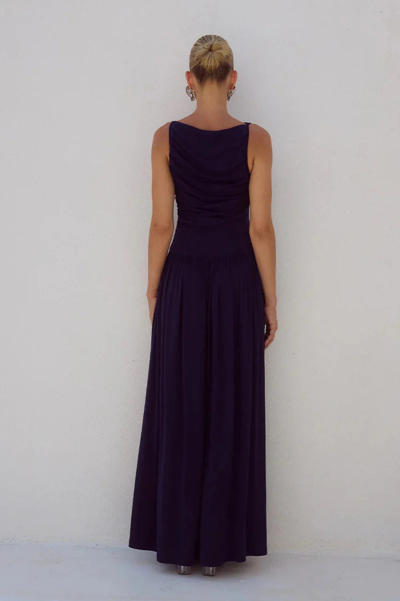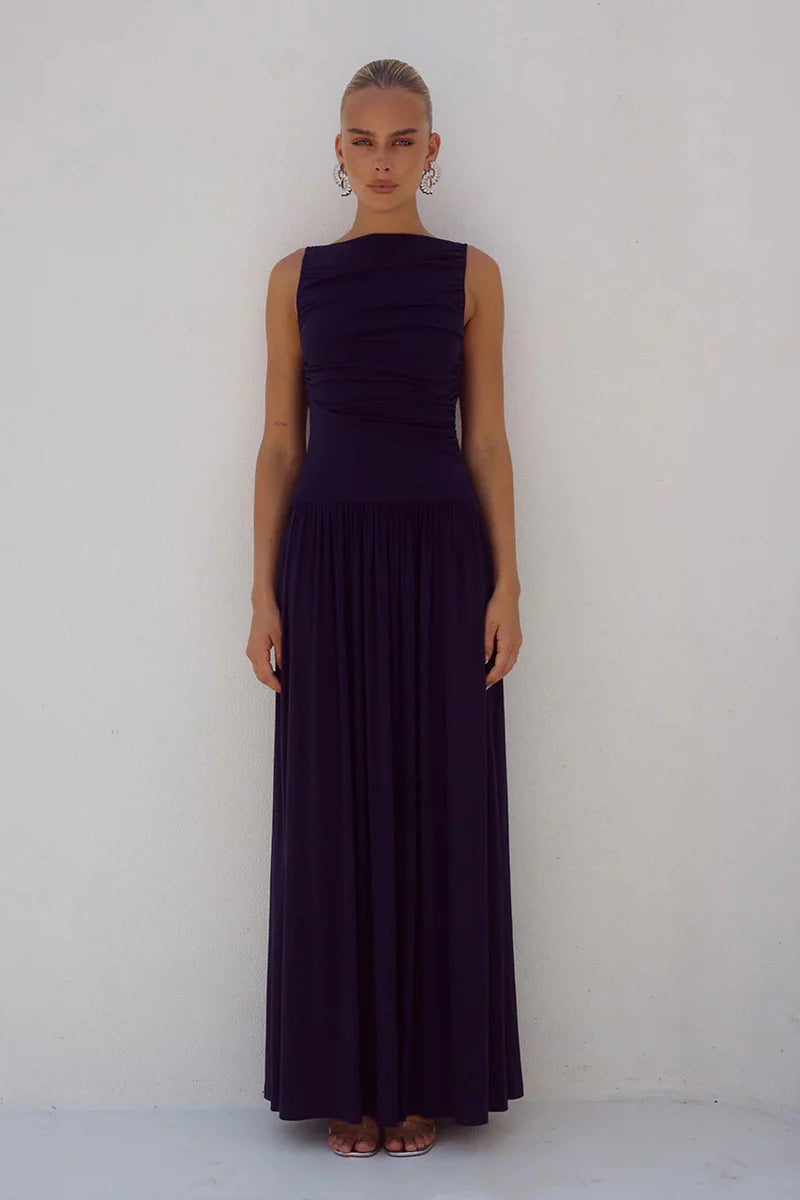 Our Nalla Maxi Dress showcases effortless elegance, with a boat neck and ruching throughout, it’s a versatile and timeless piece.