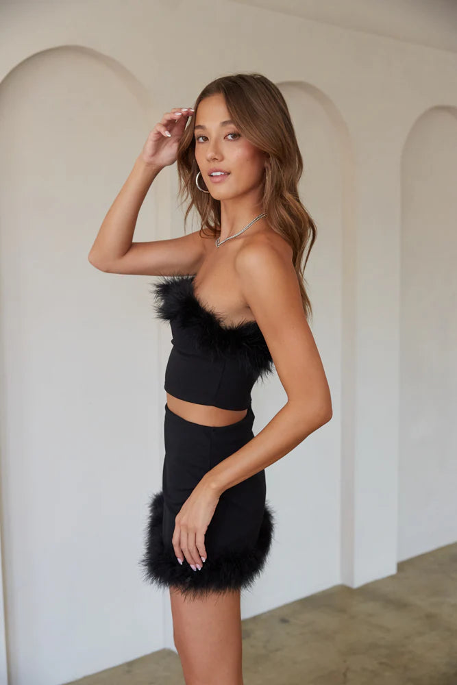 The Natalie Feather Trim Skirt is the perfect statement piece for nights out! This black mini skirt features a flirty faux feather trim hem. Pair this top with the matching to complete this trendy look!