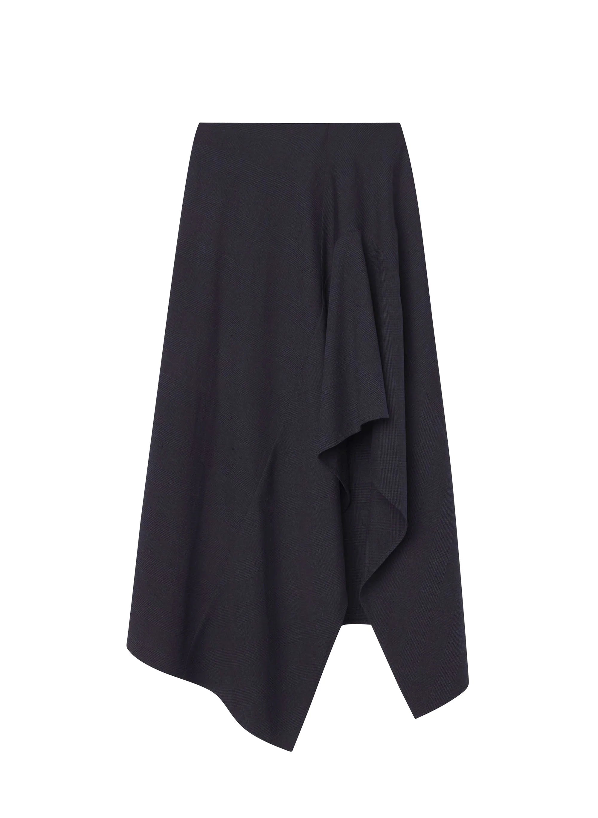 The Navy Skirt is crafted from our signature suiting blend fabric in navy blue. This midi silhouette features gathered detailing at the hip. flowing into an asymmetrically draped hemline with beautiful movement. This style runs true to size. Shop Bottoms.