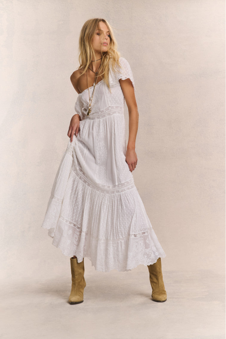 Our Norma Dress romances in cotton with all-over dot and floral embroidery. Lace trims the square neckline and flutter sleeves. At center front, on the bodice and skirt, are panels of lofty sunflower embroidery. The princess seams and waist feature inset lace details. The full sweep skirt lets out into a shirred flounce at bottom with a scalloped edge. Invisible zipper at wearer's left. Shown here in White.