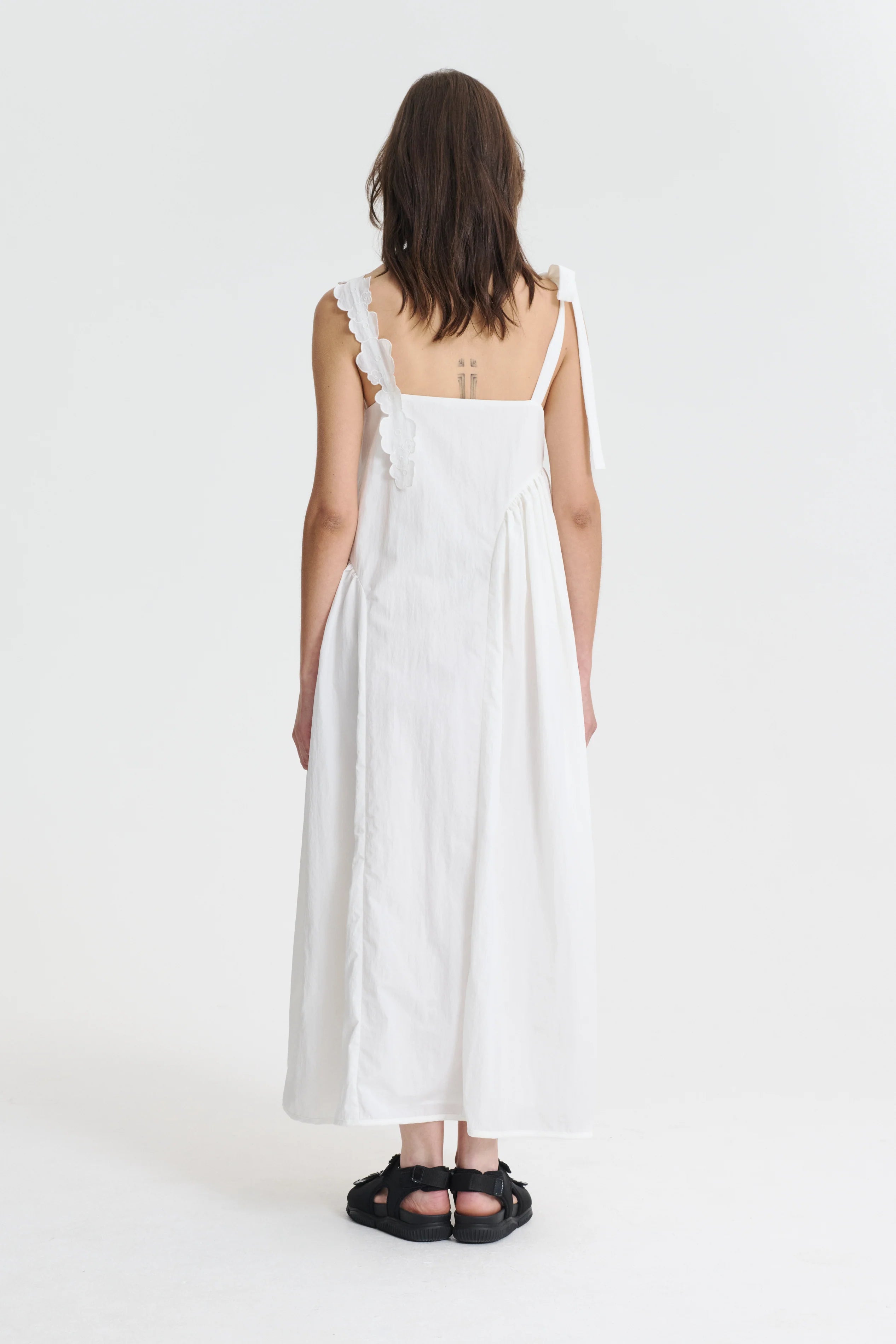 Light and easy. the Oaklyn dress. Cut from a white recycled taffeta. the romantic details are modernized by the airy fabrication. Held up by one bow strap and a strap of floral dÈcoupÈs. Asymmetric hip panels lend light volume. while another chain of florals embellish one of the panels.