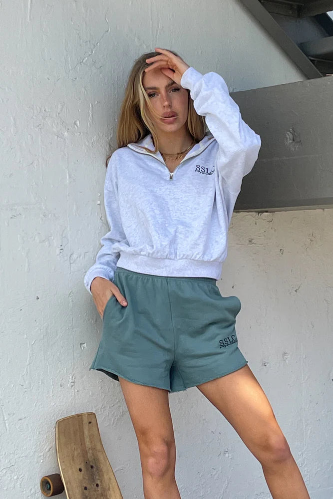 We got all your cozy needs covered in the Oceanside Half Zip Sweatshirt! This gorgeous pullover features a relaxed oversized silhouette, a half zip front, black "Sunday Skin Leisure Club" embroidery, and an open collar for a vintage feel. Available in cloud grey. Style with the to make this athleisure look a set!
