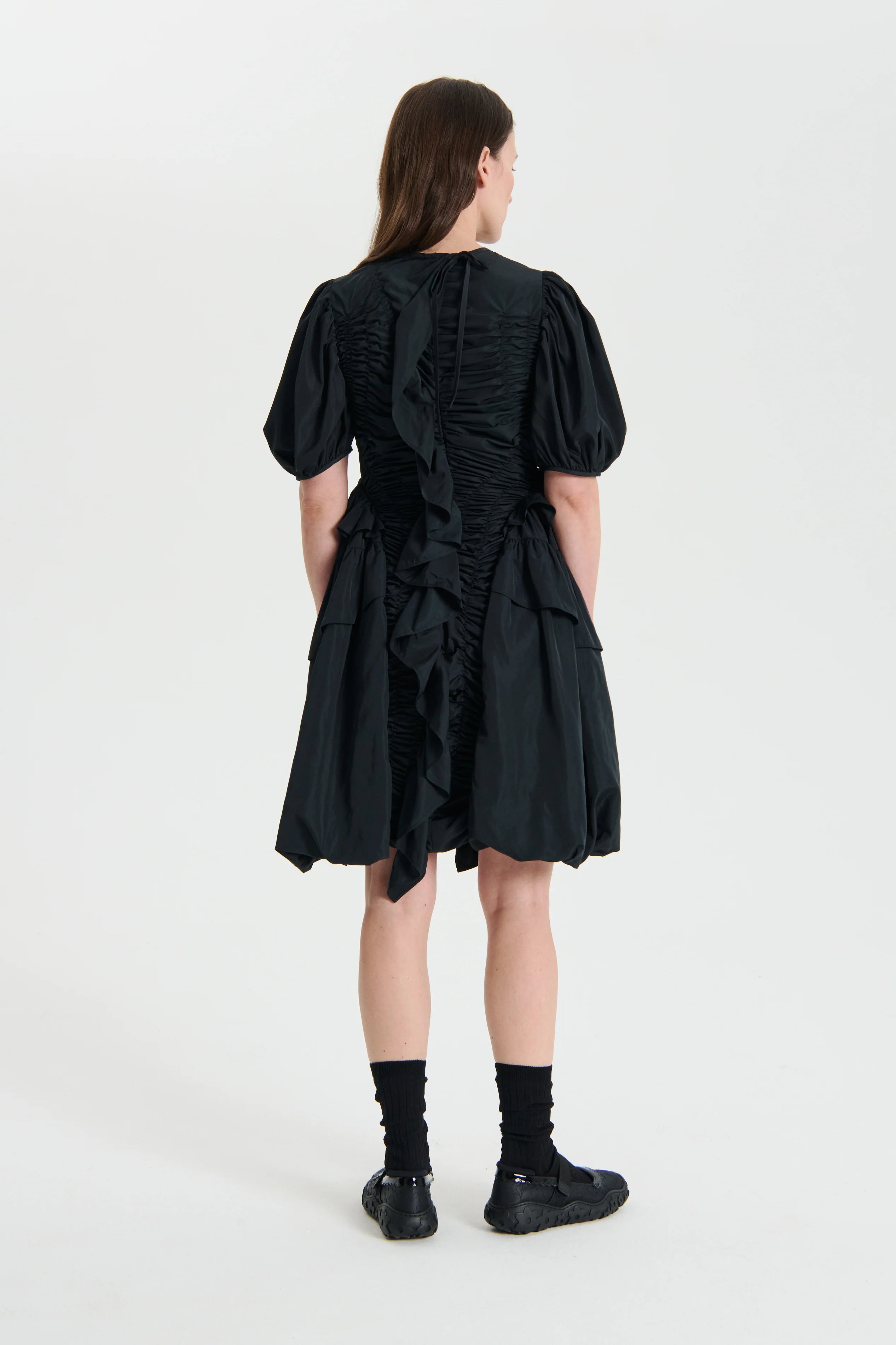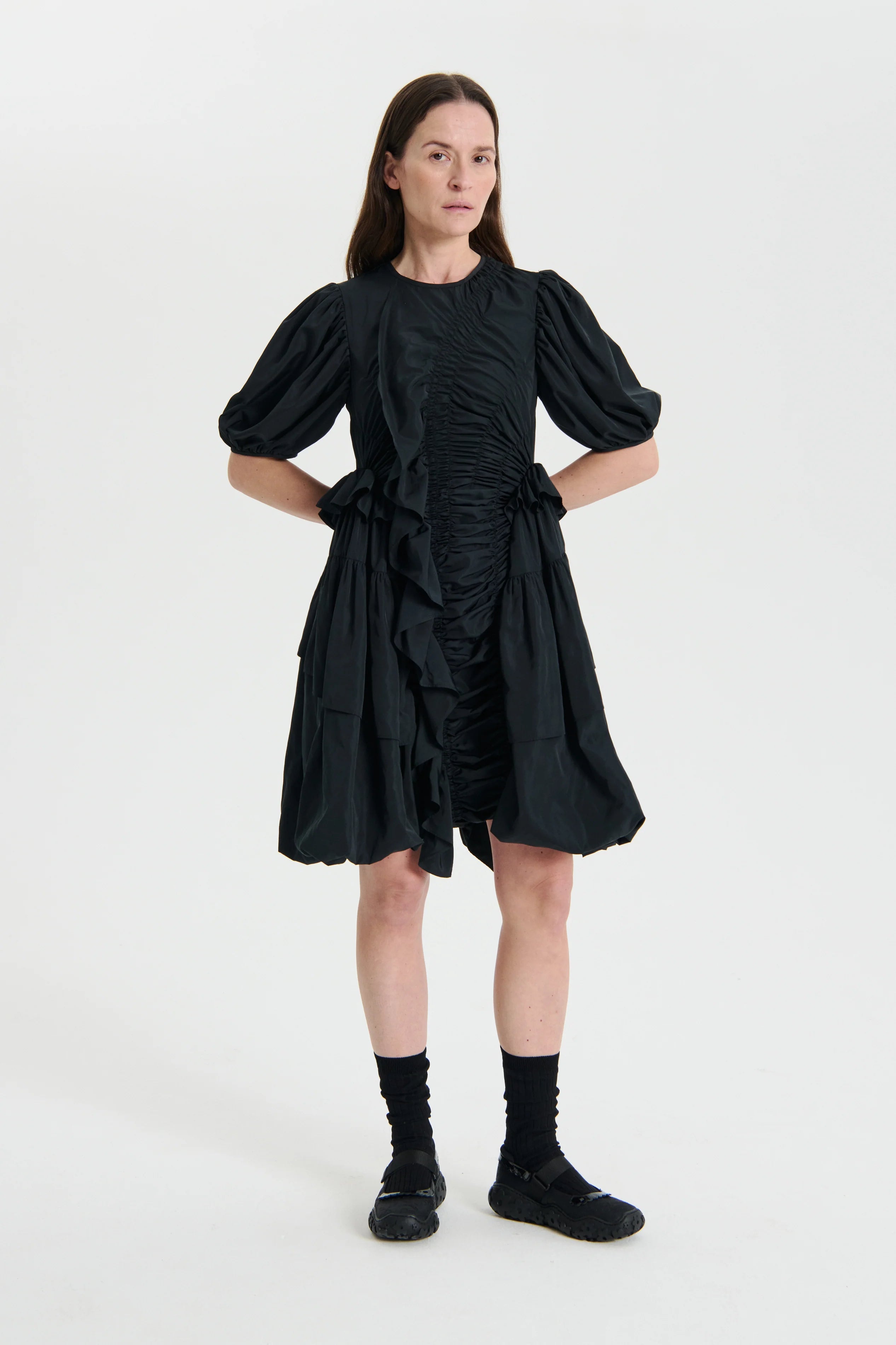 A cascade of ruffles and rusching. the Olena dress. Featuring hip inserts and puff sleeves. the romantic silhouette is cut from a utilitarian recycled faille for light. sporty movement.