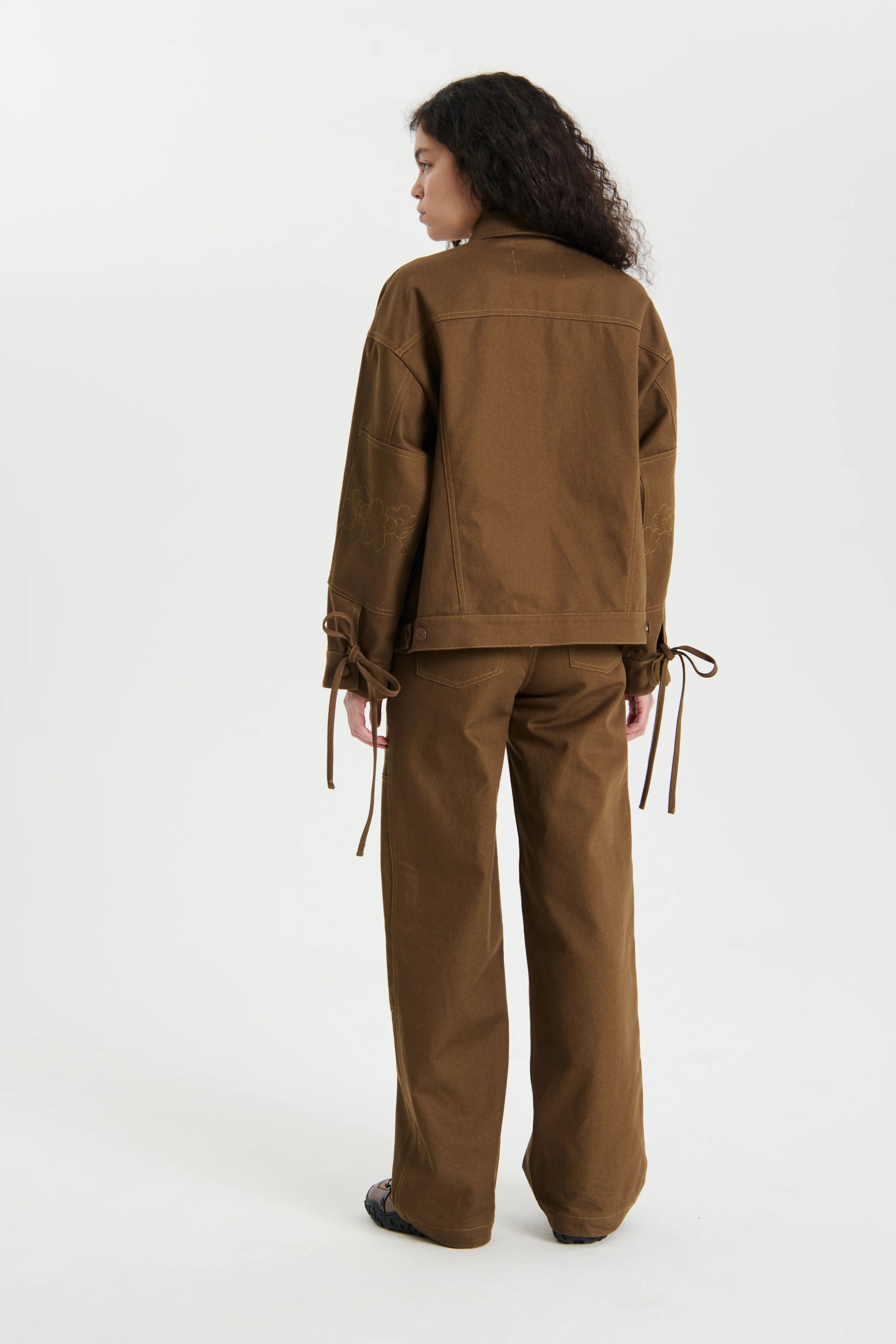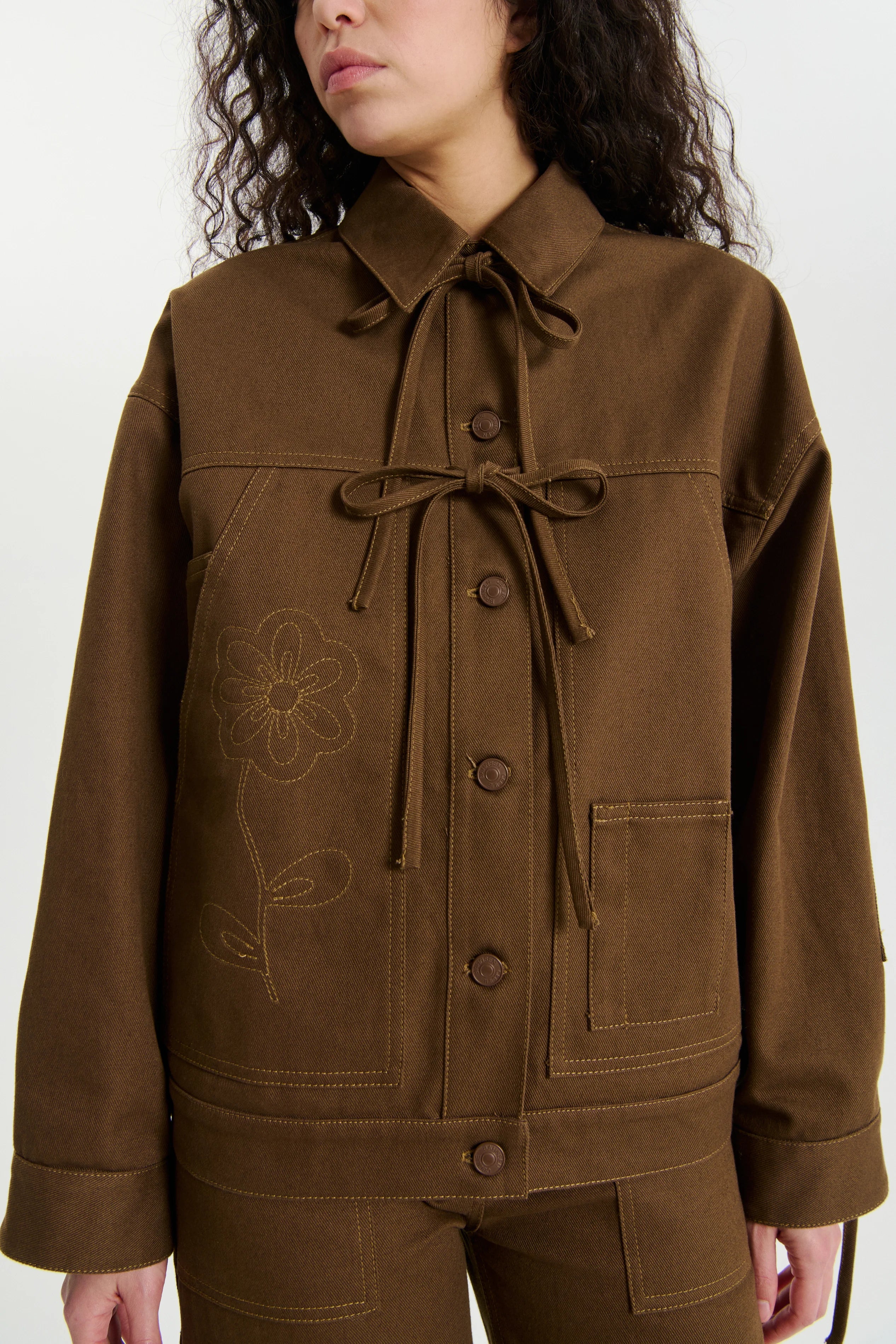 Expanding her range of outerwear with a new silhouette. Cecilie Bahnsen introduces the Olga jacket. crafted from a brown denim. Blending masculine and feminine codes. the oversized jacket is complete with signature bow ties and patches featuring motifs of the season.