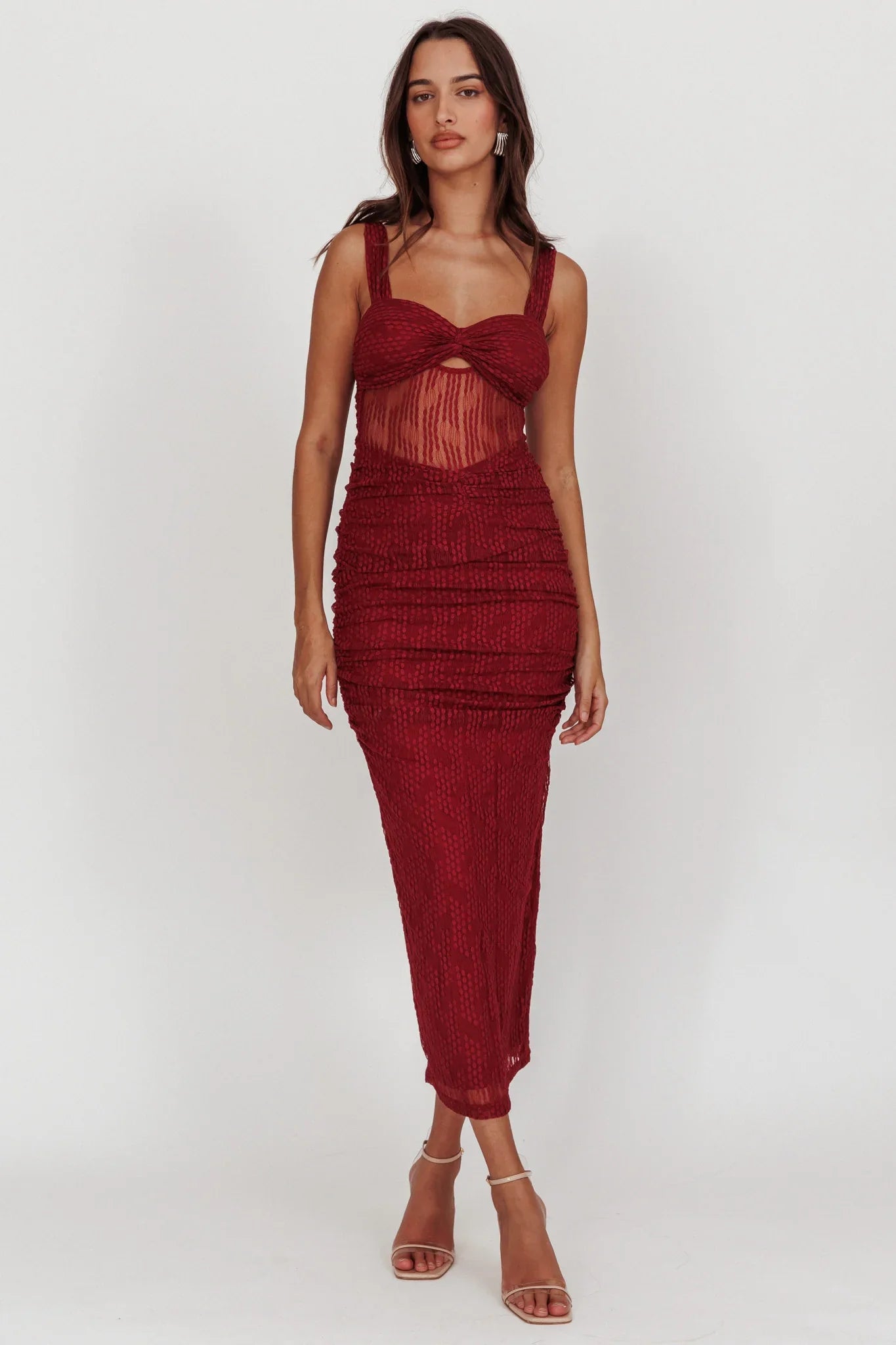 Make an entrance in our gorgeous Oliana midi dress. We are in love with its embroidered mesh overlay and ruching detail. Perfect for a romantic date night teamed with strappy heels and a clutch.