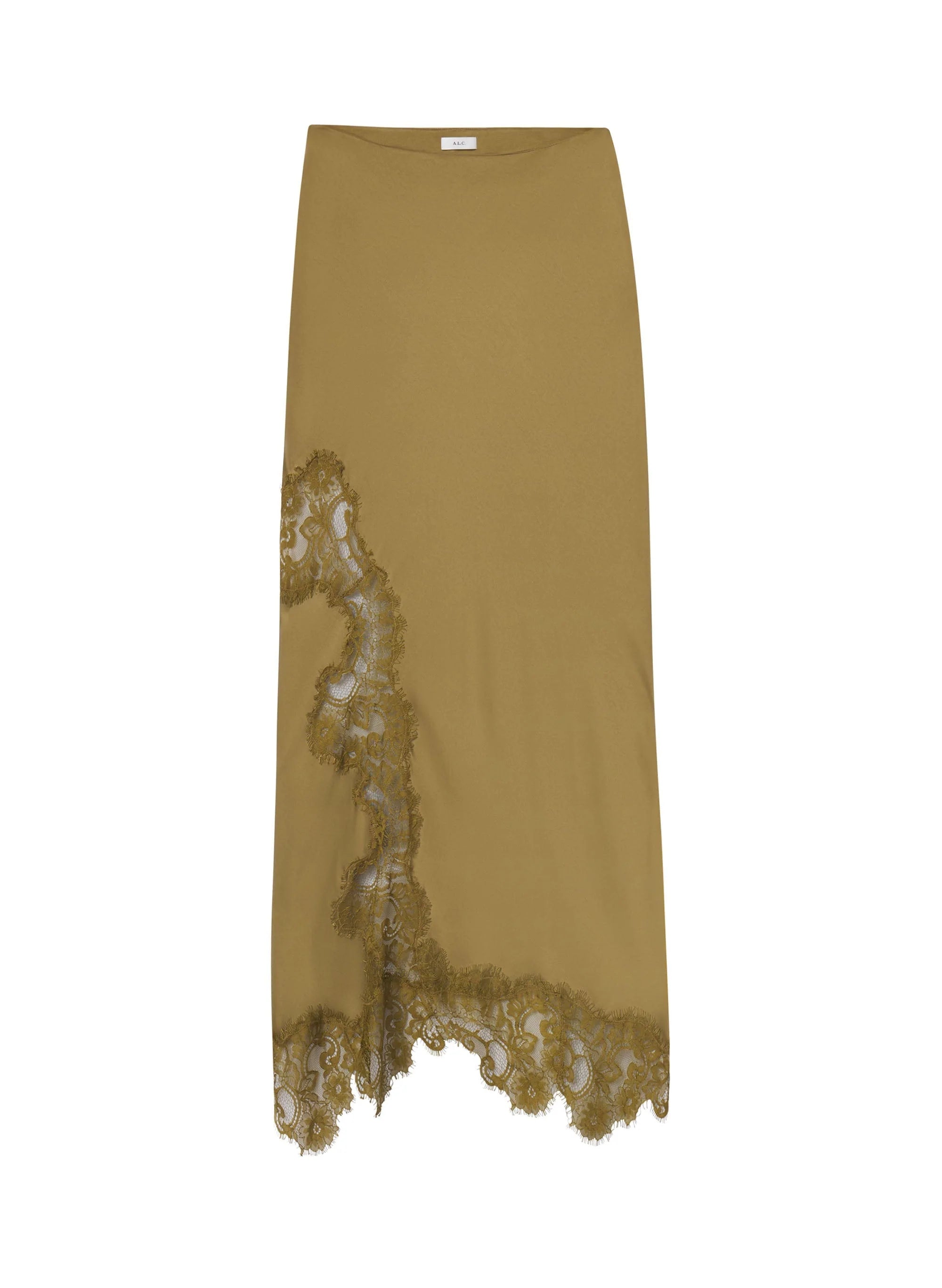 The Olivia Skirt is crafted from our fluid viscose fabric in a pyrite hue. This full-length silhouette features tonal lace detailing along the side and encircled around the hem. This style runs true to size. Shop Bottoms.
