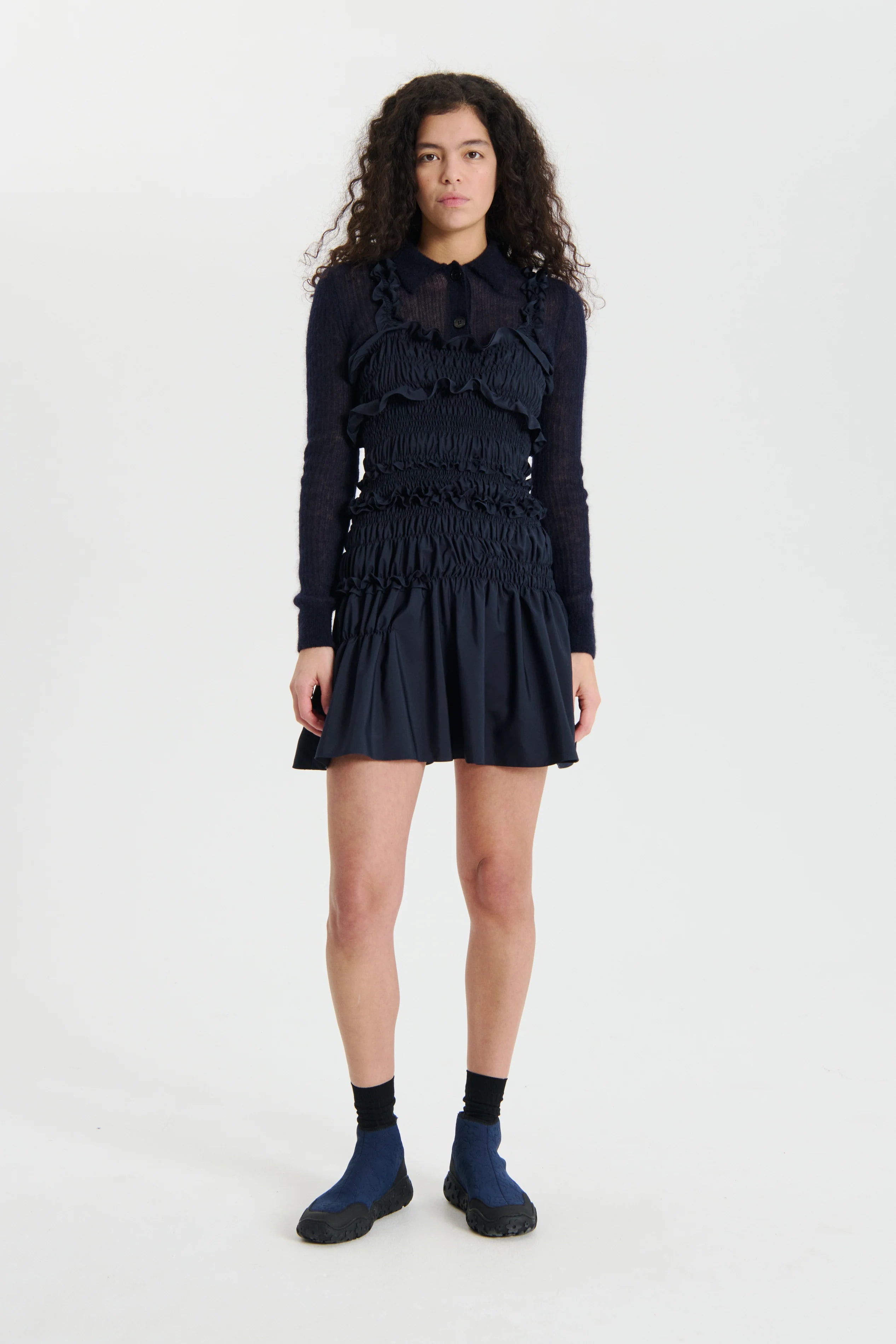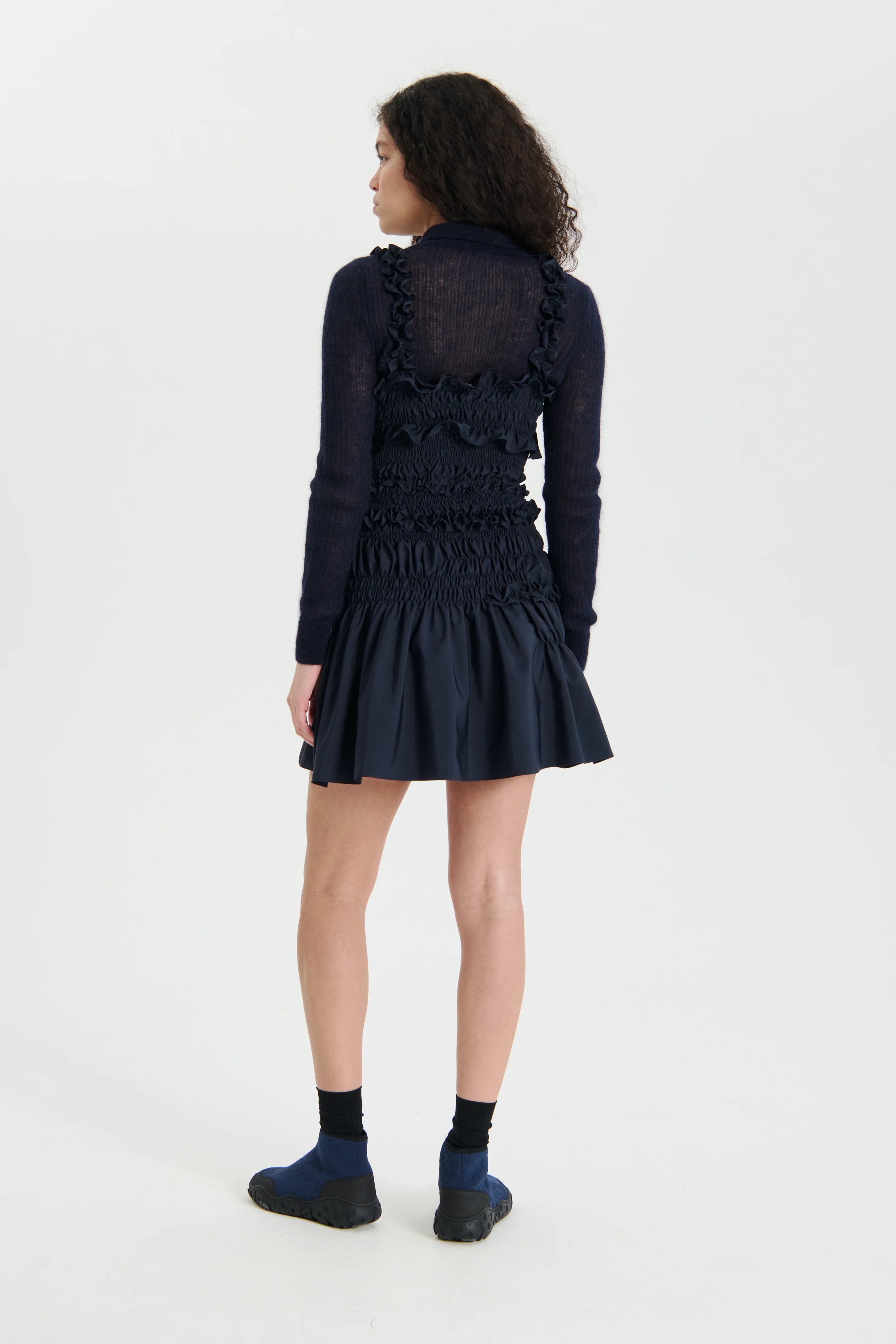 Unabashedly feminine. the Oona dress is a romantic design cut from navy recycled faille. The fitted silhouette is elevated by signature smocking details for additional stretch. and held up by ruffled straps.