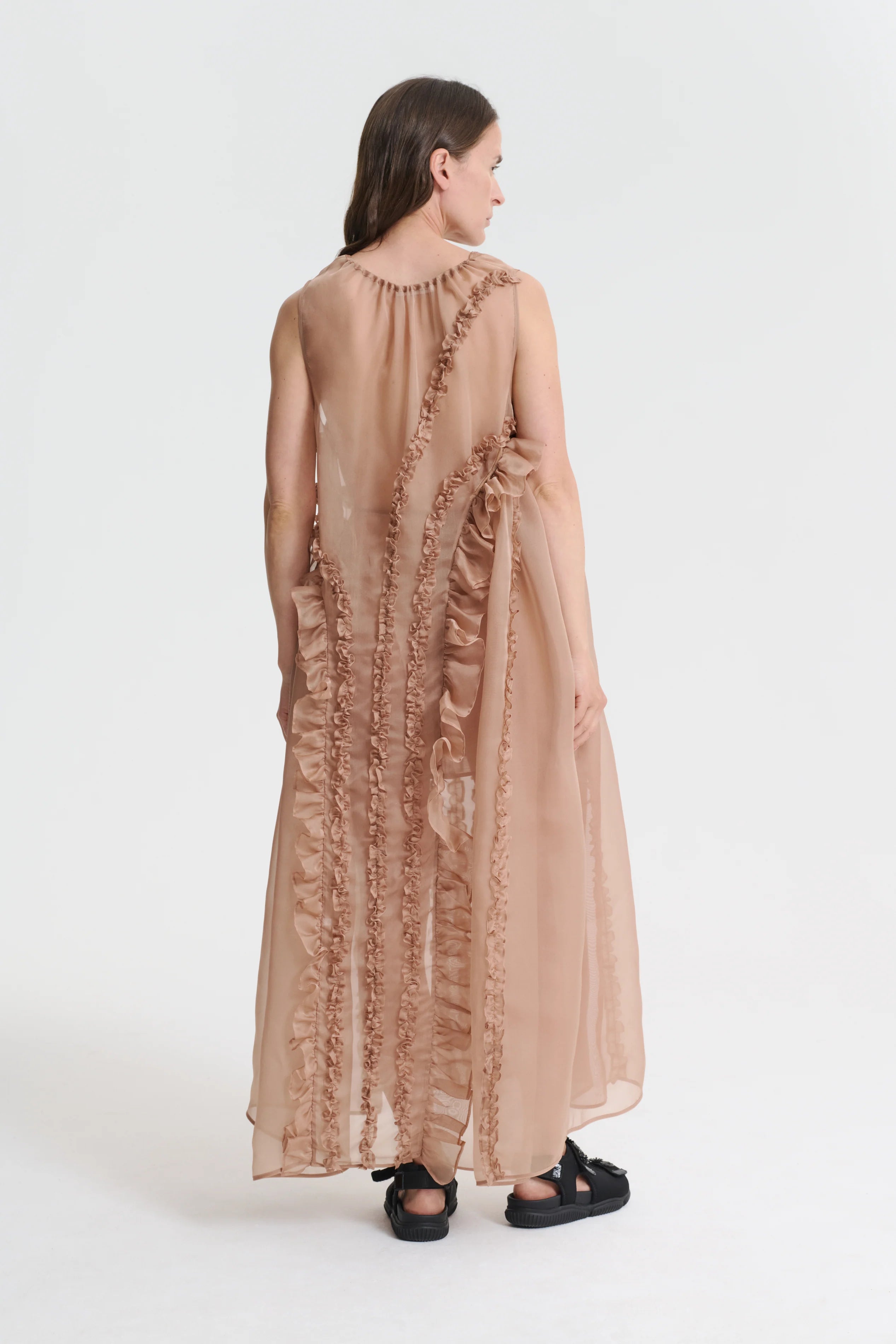 Darling and dreamy. the Opal dress. A new take on the shift gown cut from satin organza. embellished with a ruching story and hip panel ruffles. An easy silhouette pulled together by wisp-thin ribbons.