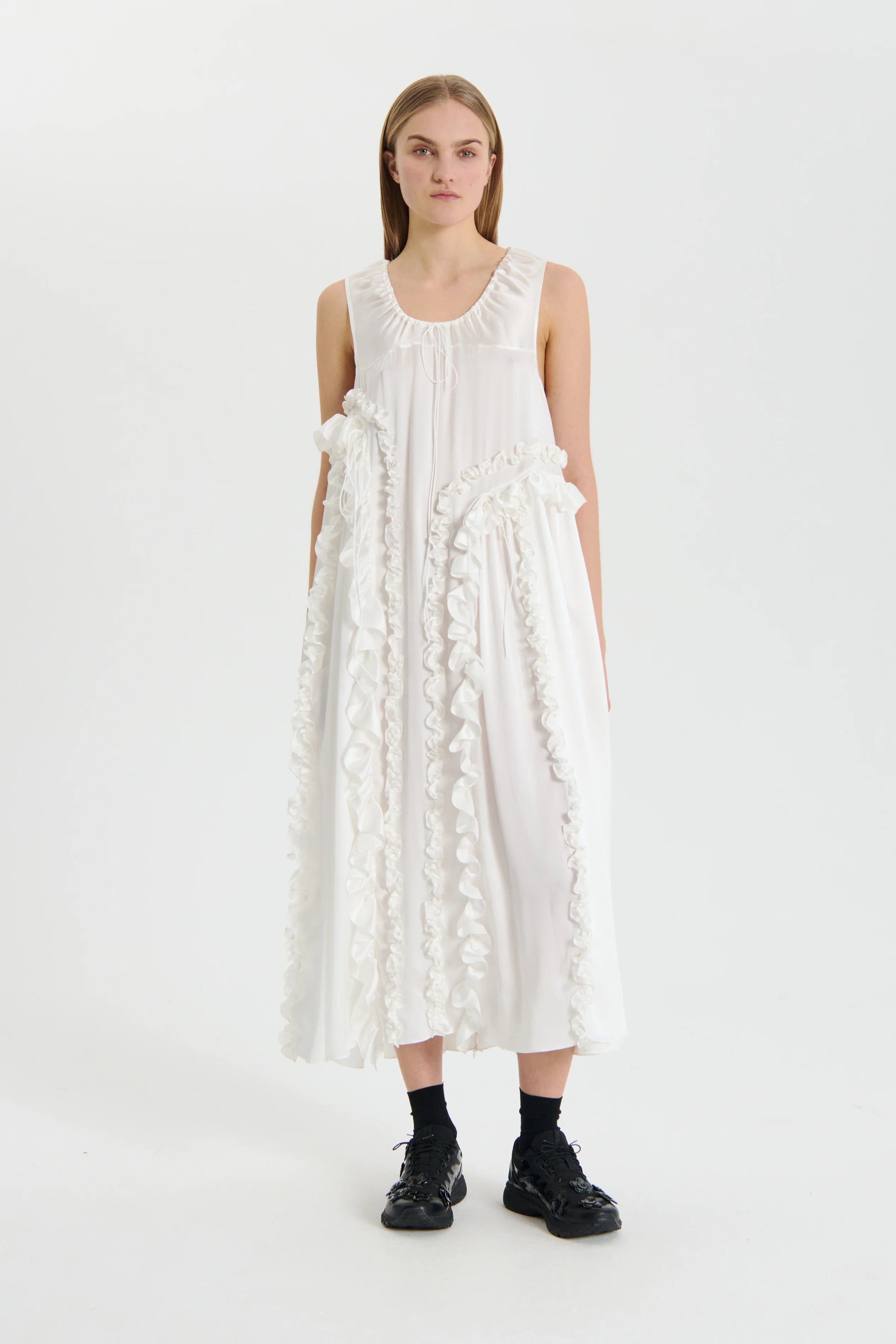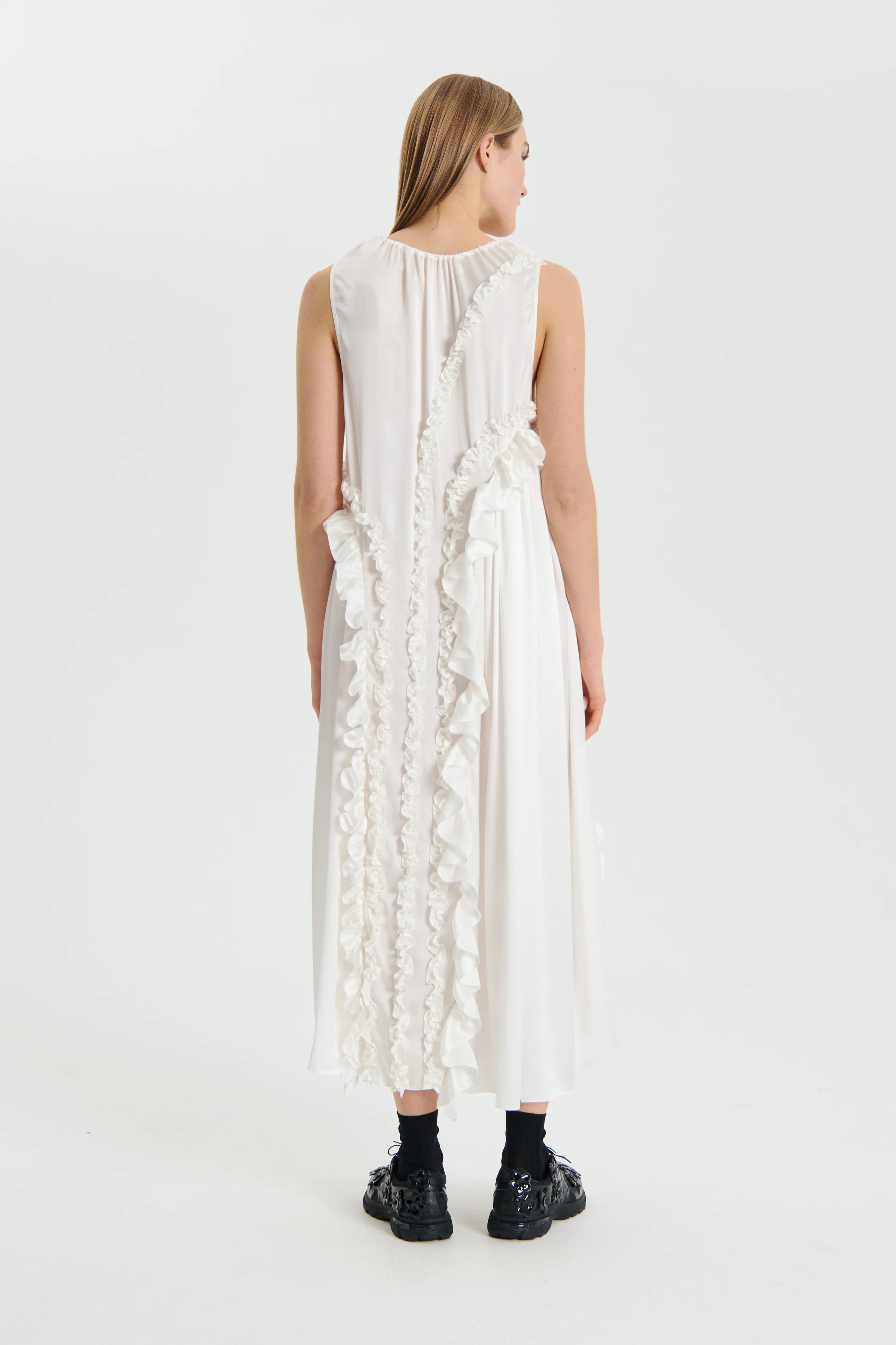 Ethereal and elegant. the Opal dress is a vision of effortless grace and understated allure. This easy pullover long dress features a sleeveless construction and gentle scoop neck. an indulgence in timeless charm. Adorned with asymmetric ruffles cascading along the front and back. the dress dances with every step. evoking a sense of whimsy and romance. Crafted from luxurious silk satin. its glossy finish adds a touch of opulence to its silhouette. ensuring shine with every movement.