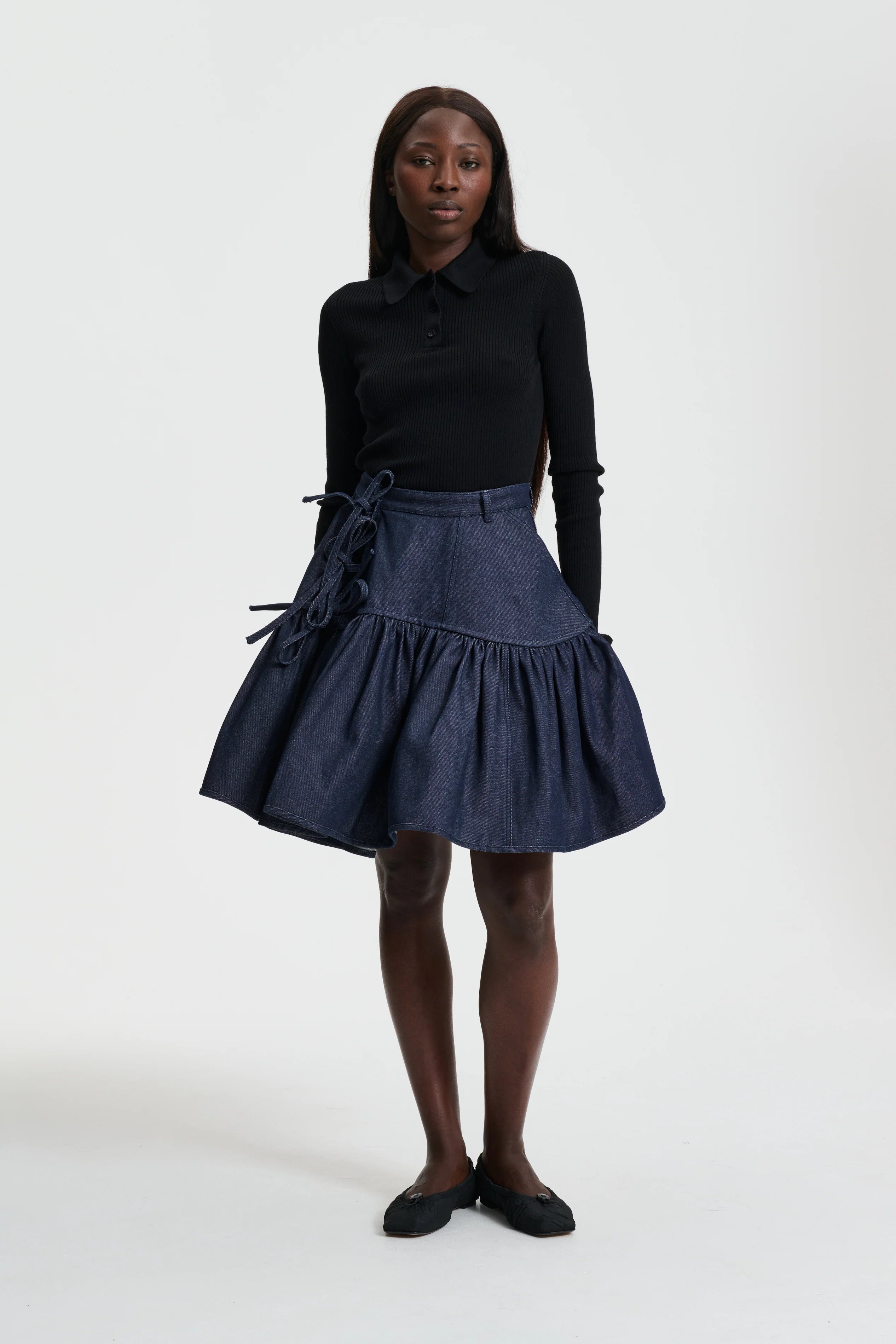 Voluminous and modern. the Oprah skirt. Showcasing couture craftsmanship with its bespoke denim manipulation with floral decoupÈs. Constructed from a [blue denim]. the short skirt features bow detailing across the front and back pockets.