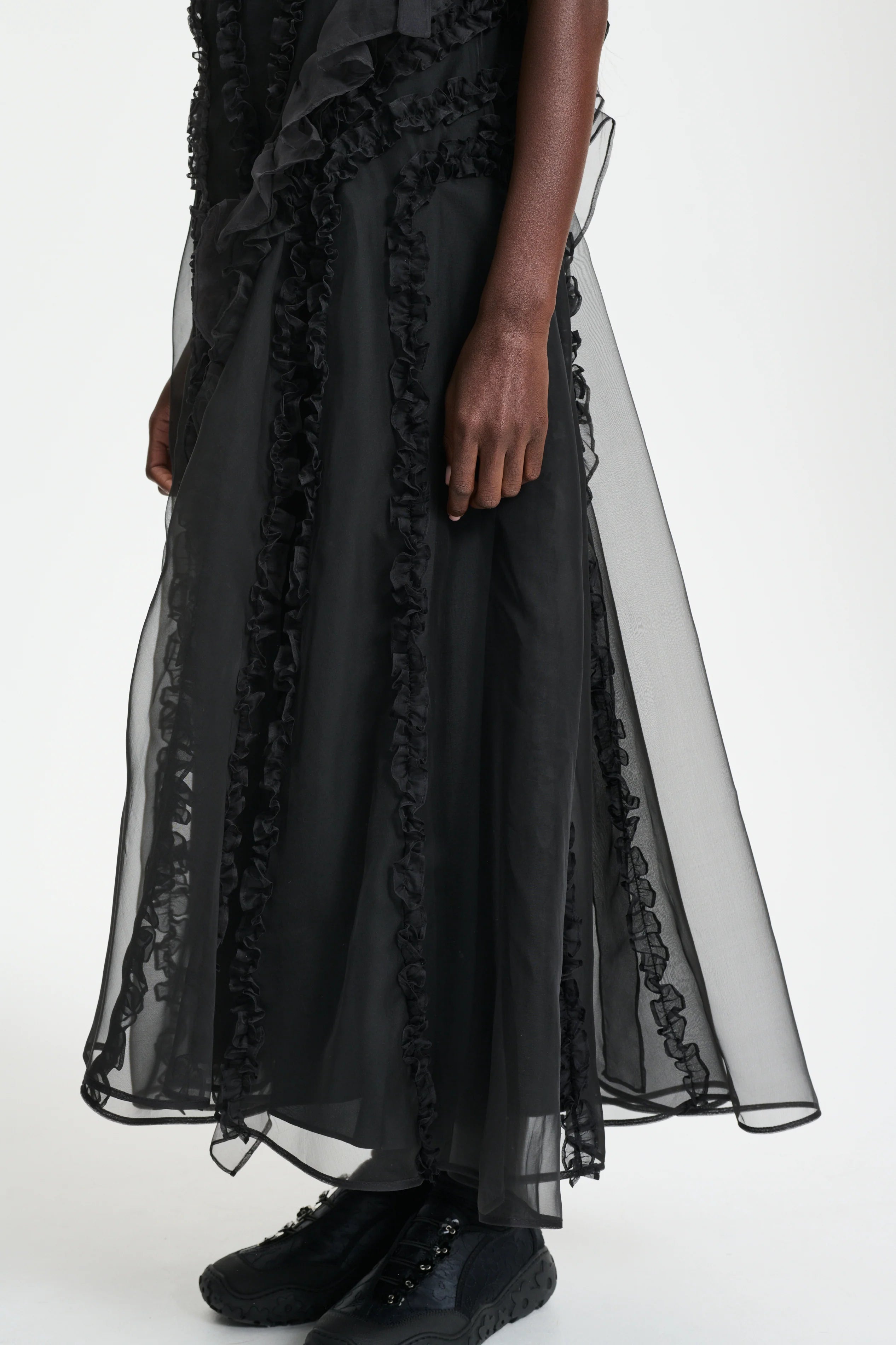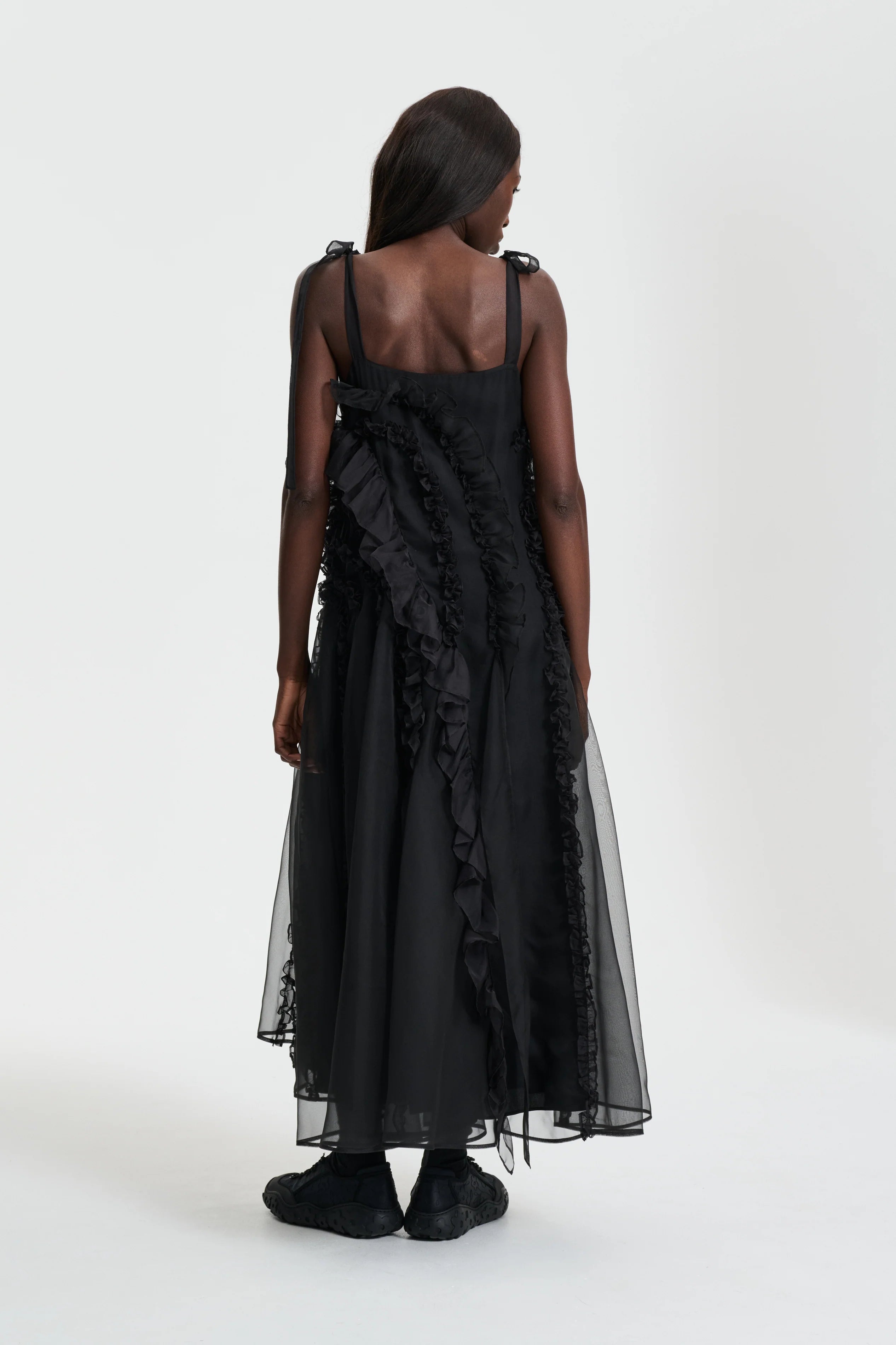 Unveiling a captivating contemporary elegance. the Otis dress. The shift-like strap dress embraces effortless charm with its asymmetrical ruffle details. lending a dynamic edge to its silhouette. Crafted with adjustable shoulder straps made from luxurious satin organza. it offers both style and versatility. The inner lining adds a subtle layered effect. ensuring a sophisticated finish. The show look was styled with a floral embroidery bra to elevate the look. and is not part of the dress.