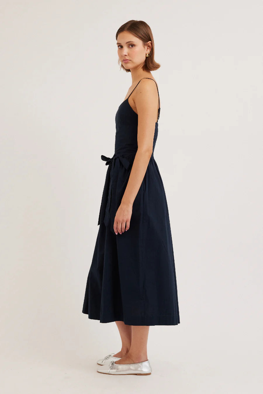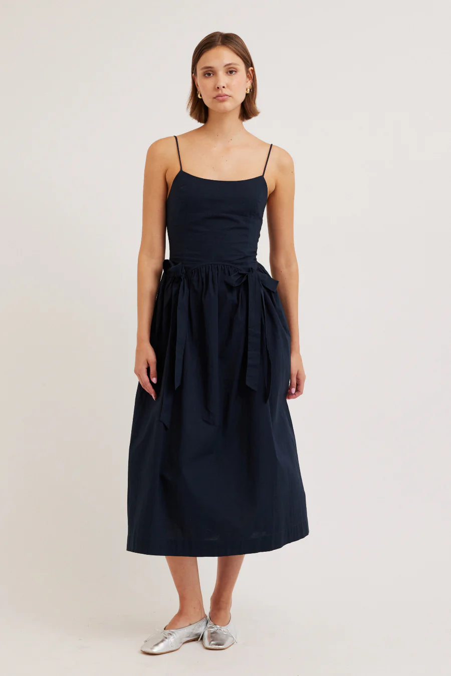 The Penelope apron dress is our navy midi dress featuring a corset style bodice with waist seam details and bows that gather into a fuller skirt.