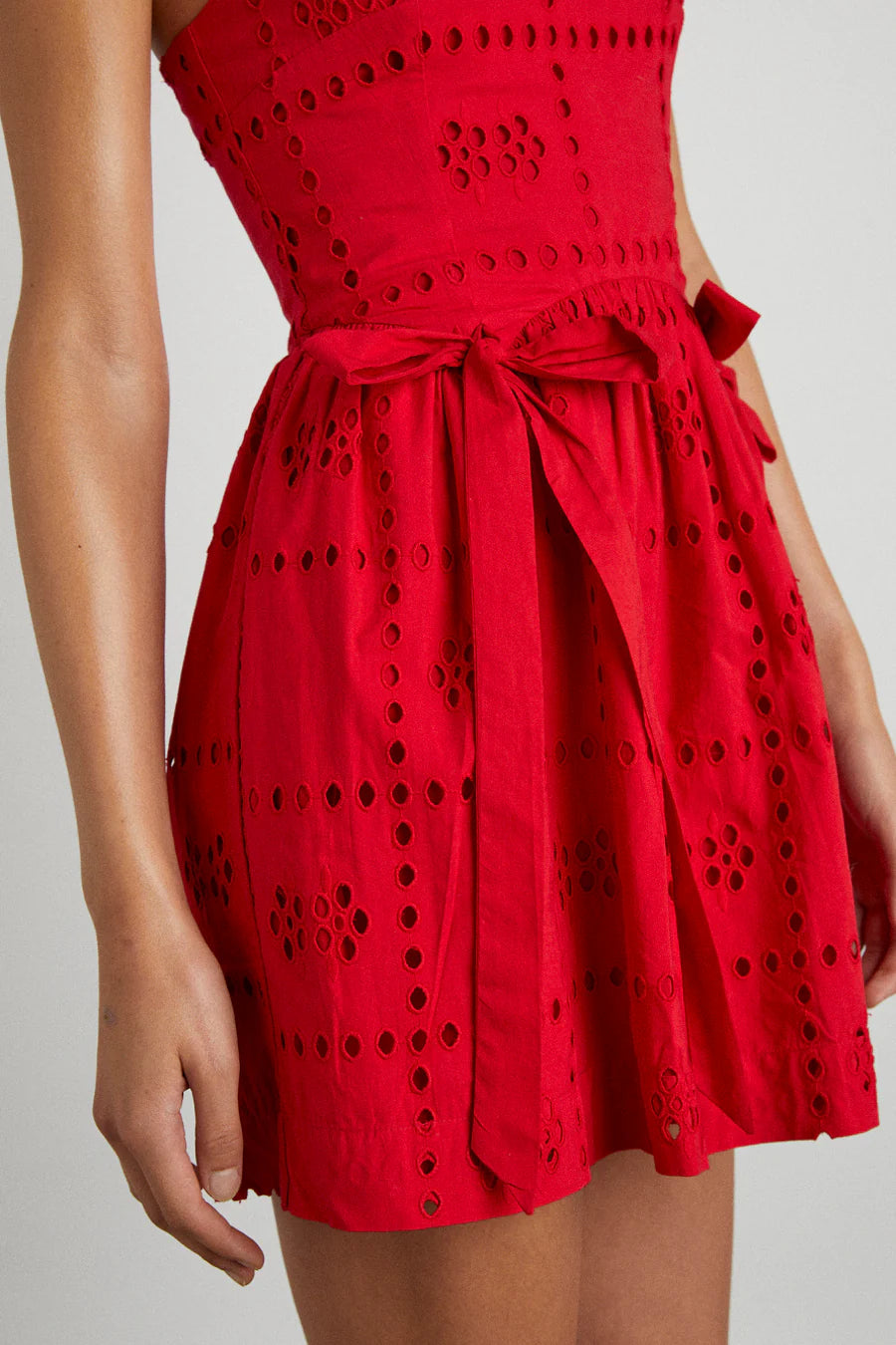 The Penelope apron dress is our red broderie mini dress featuring a corset style bodice with waist seam details and bows that gather into a fuller skirt.