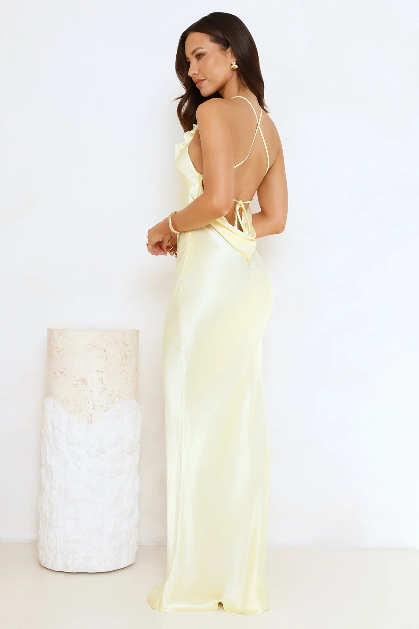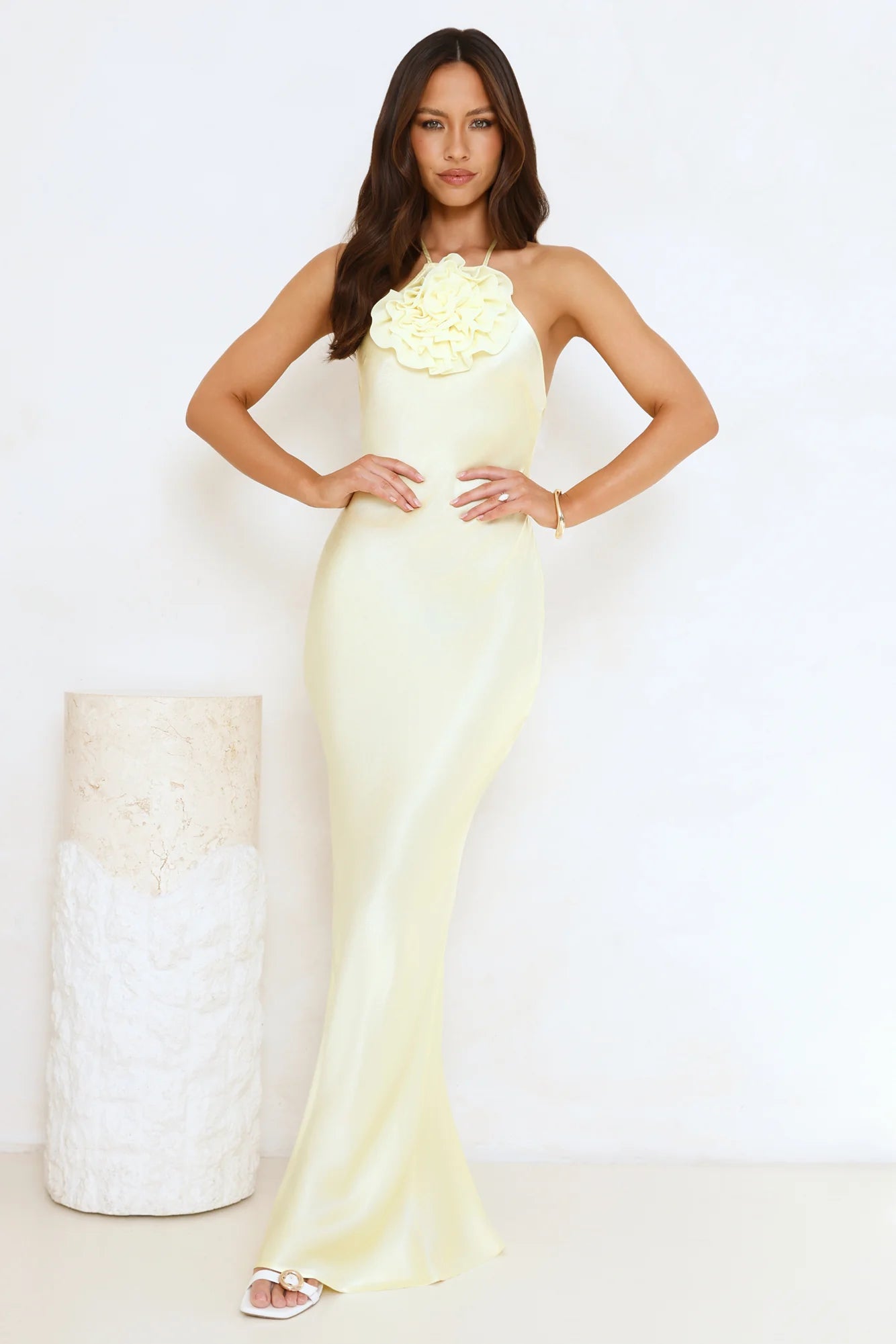The Piazza Nights Satin Maxi Dress is pure magic with its silky satin finish, dreamy chiffon-style flower detail, open back with a crisscross tie, and a straight, flowy skirt that glides with every step. Just add soft waves and heels for a look that feels like a fairytale.