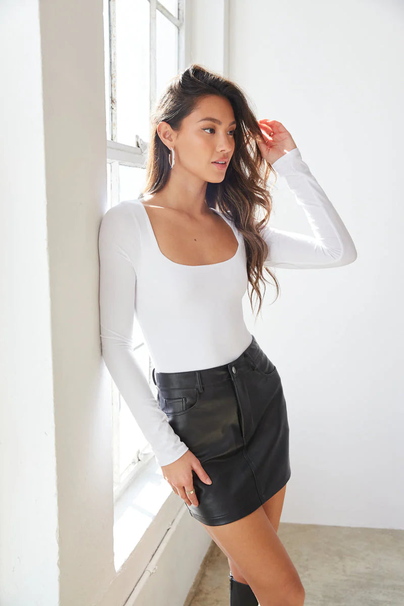 So chic in the Polly Long Sleeve Bodysuit! Available in white and black, this super soft wardrobe essential features a scoop neckline, long sleeves, and a fitted silhouette. Pair with the to complete the look!