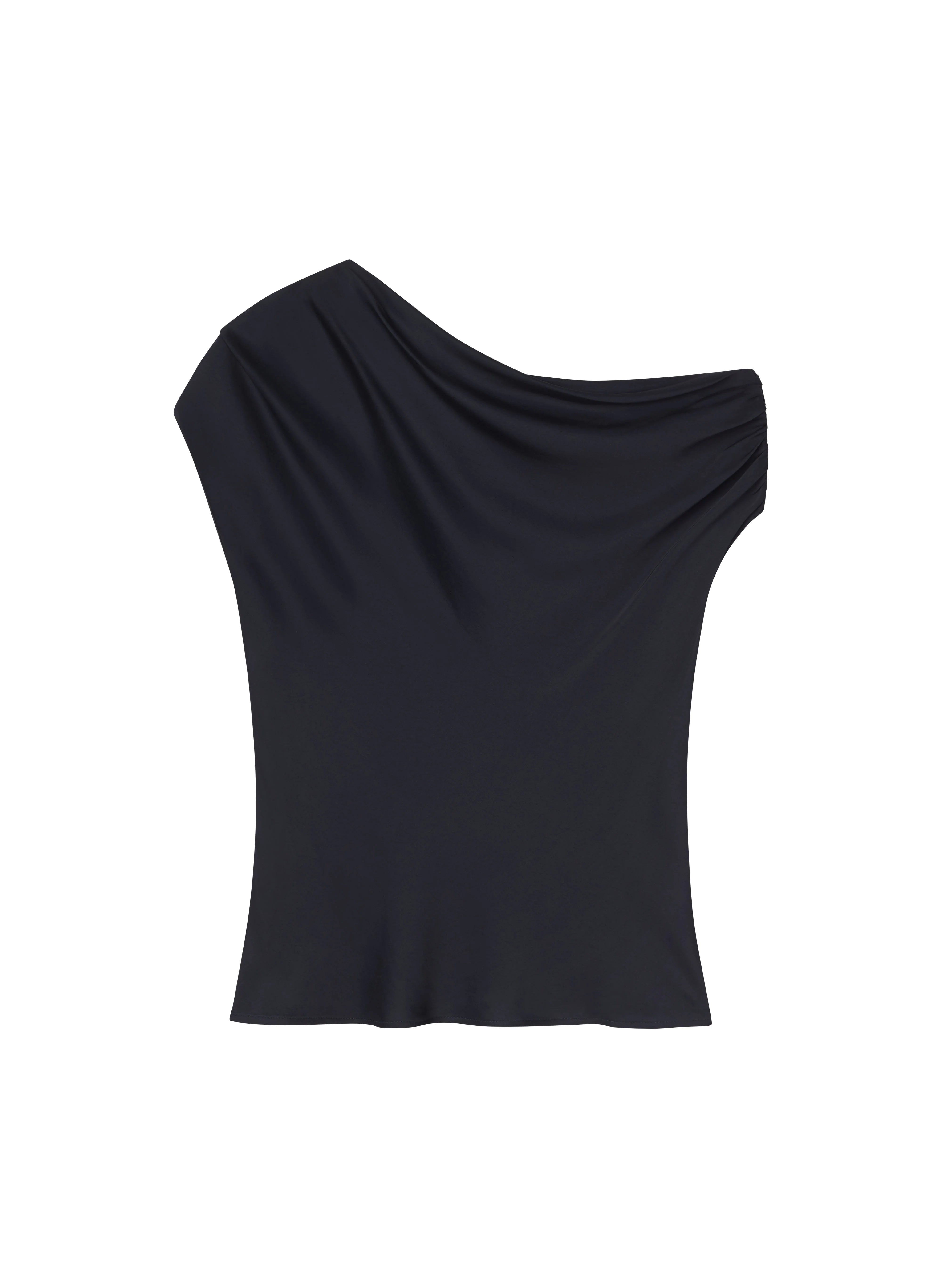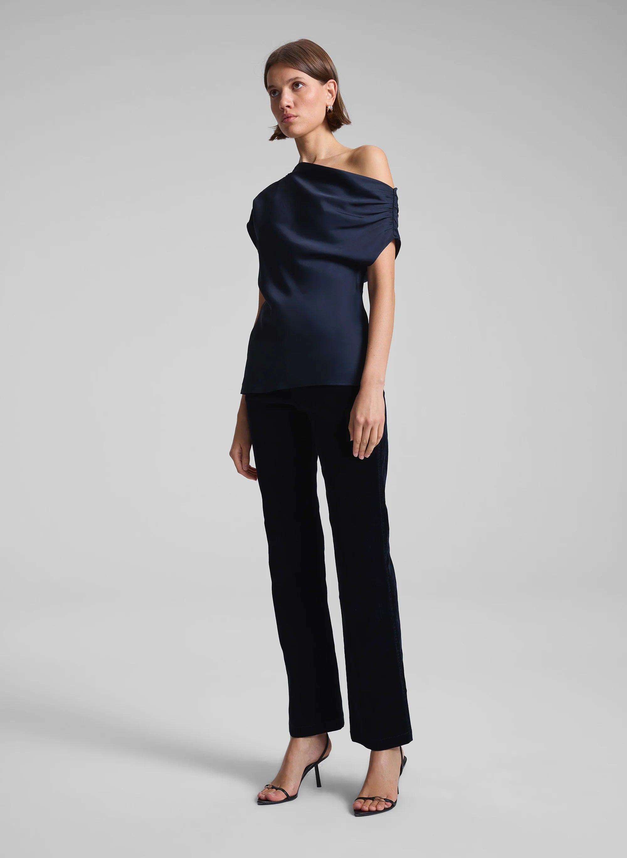 The Poppy Top is crafted from lustrous sapphire blue satin with captivating fluidity. Featuring a draped neckline and ruched detailing along the side. this elegant silhouette sits off one shoulder. providing a sophisticated yet modern appeal. Shop Tops.