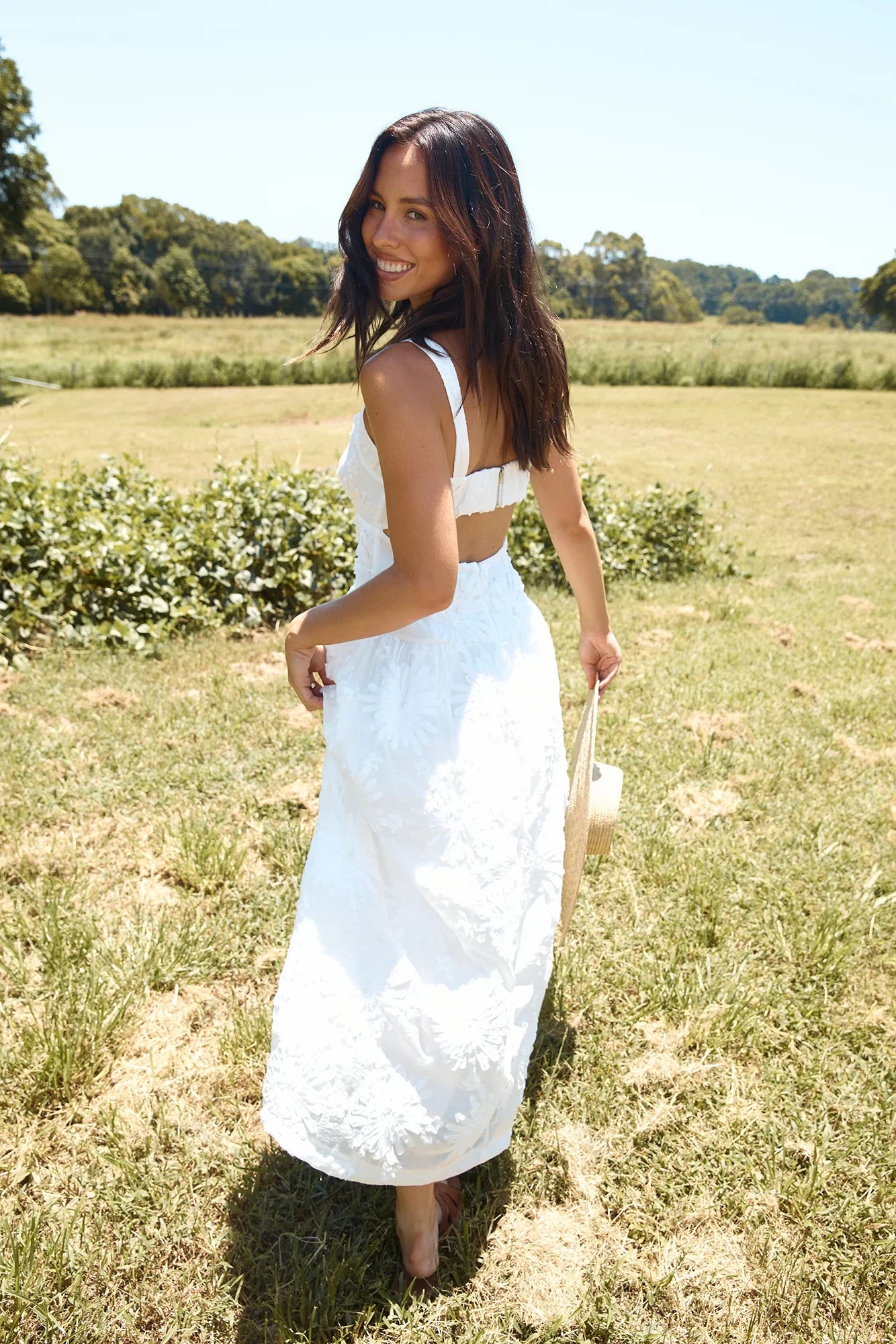 In our Porcelain Princess Maxi Dress in White, you'll be a vision of ethereal elegance for your summer escapades. Whether you're sipping champagne at a garden party on the French Riviera or twirling through the streets of Positano, let this dress make you feel like royalty in every enchanting moment.
