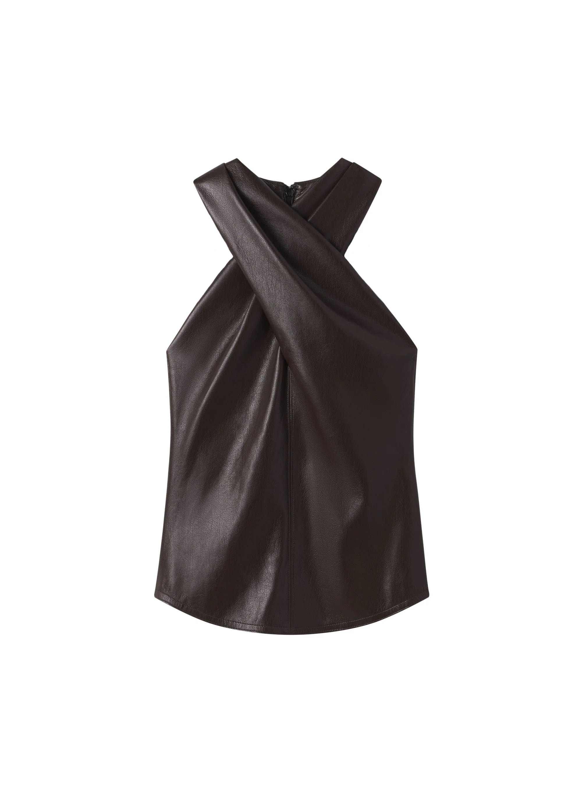 The Quinn Top is crafted in our buttery soft vegan leather fabric in a chocolate plum hue. This sleeveless silhouette features an overlapping halter neckline that zips in the back with topstitch detailing down the center. This style runs true to size. Shop Tops.