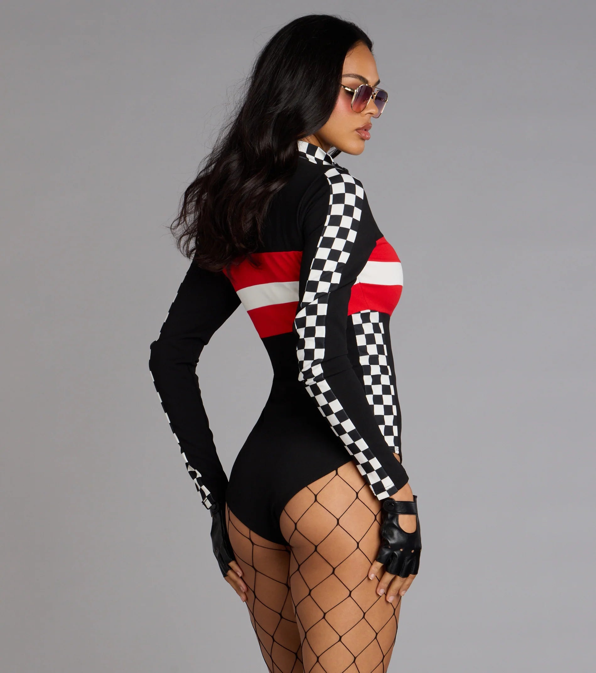 Set hearts racing this Halloween in a racer costume! The bodysuit features a mock neck with a plunging V-neckline with zippered closure, fitted long sleeves with a checkered design, contrasting stripe design at the bust, and cheeky coverage. Complete the costume with fishnet tights and faux leather gloves.