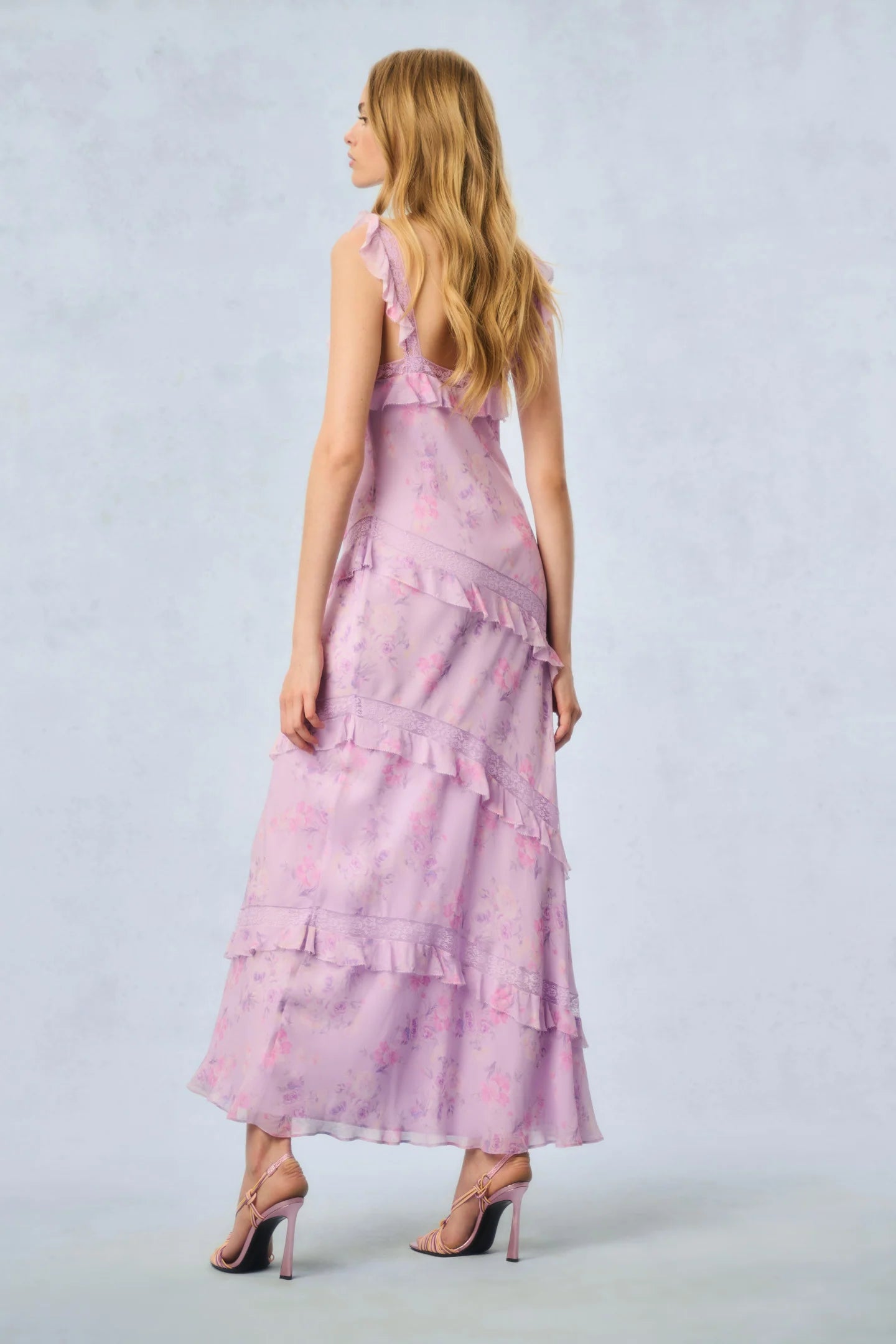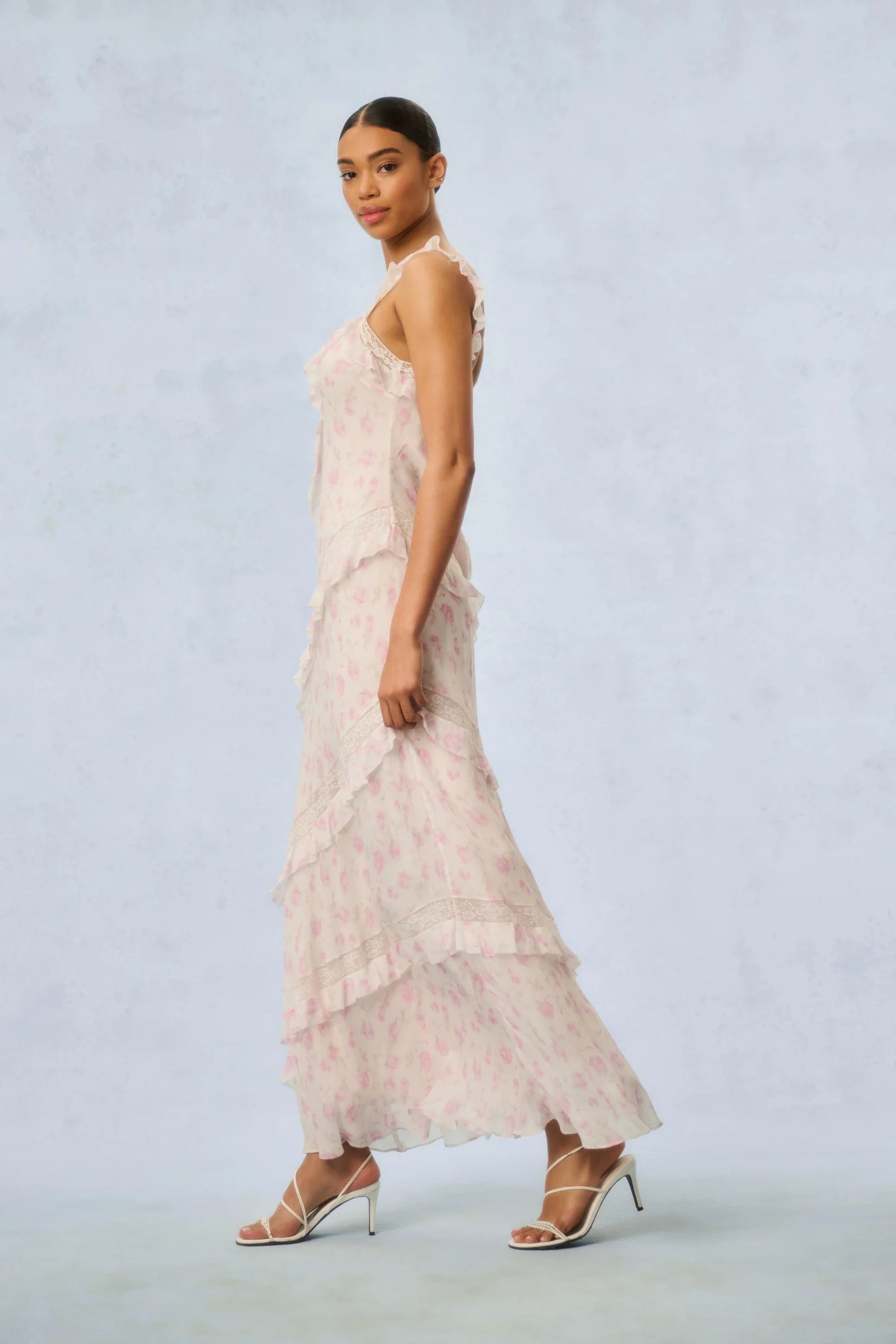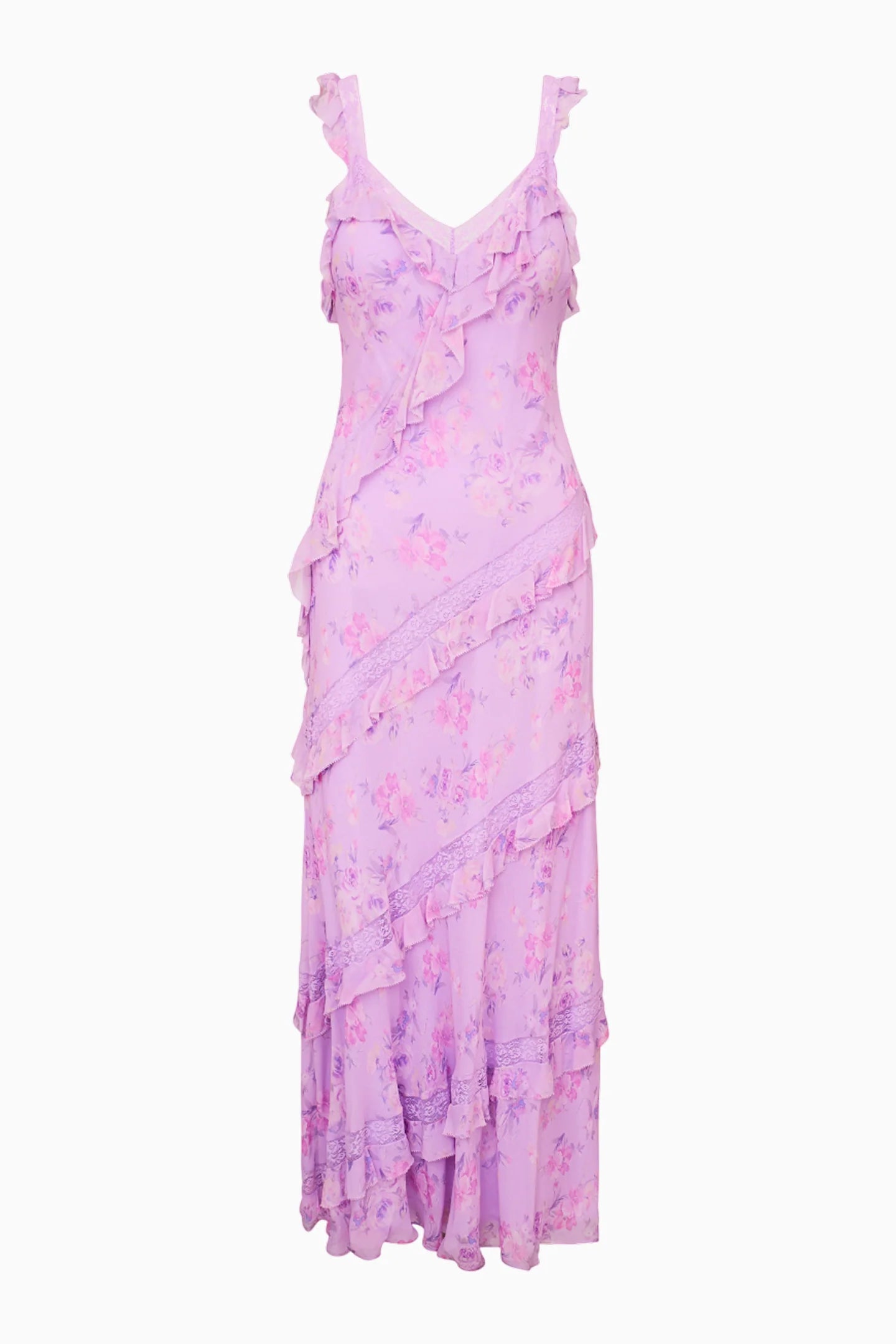 Our best-selling Radiance Dress returns as part of our Fragrance Capsule Collection, this time arriving in our beloved perfume prints. This dreamy maxi is designed with a printed chiffon fabric for the warm weather season. With an airy and breezy silhouette, the dress is stripped with delicate laces all over sourced from vintage textiles. The pieces begin with lace straps that fall to tiny flutter sleeves that fall to an easy skirt with tiny ruffle details all over.