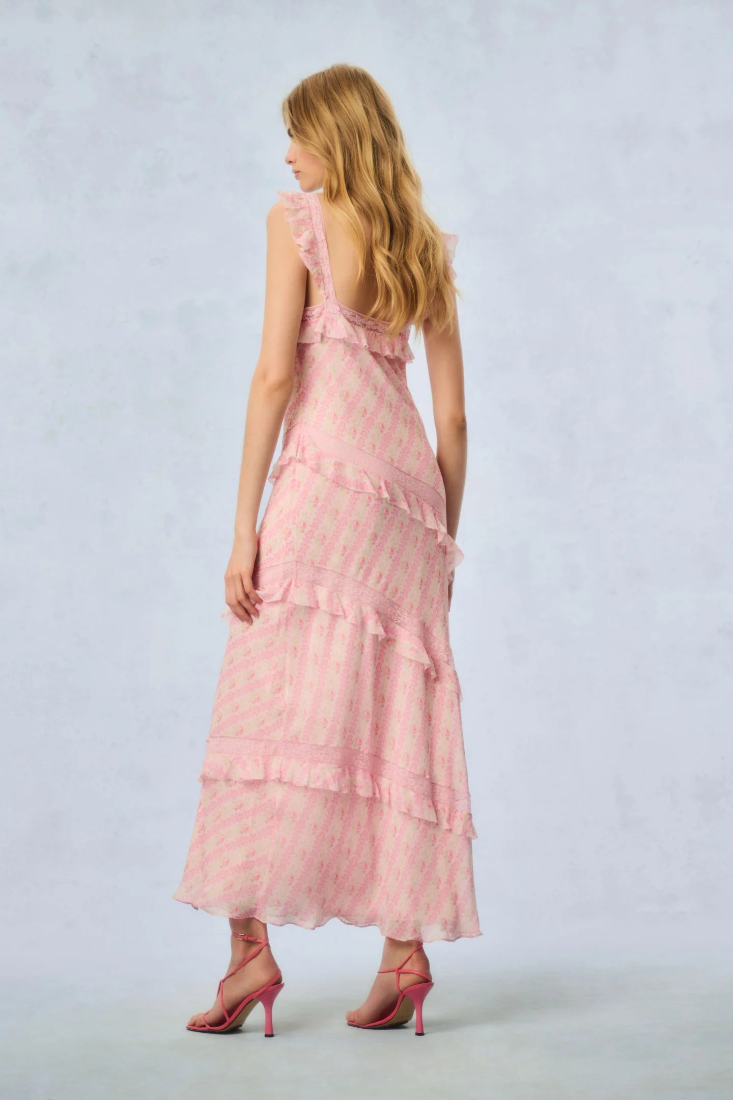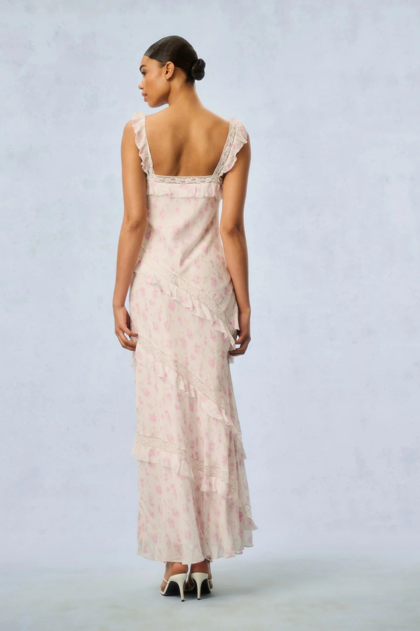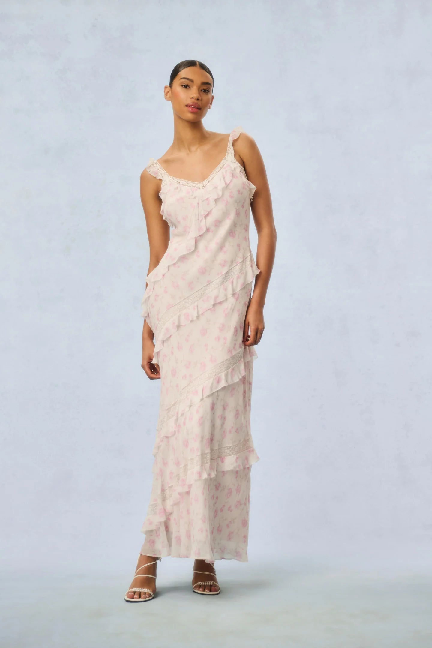Our best-selling Radiance Dress returns as part of our Fragrance Capsule Collection, this time arriving in our beloved perfume prints. This dreamy maxi is designed with a printed chiffon fabric for the warm weather season. With an airy and breezy silhouette, the dress is stripped with delicate laces all over sourced from vintage textiles. The pieces begin with lace straps that fall to tiny flutter sleeves that fall to an easy skirt with tiny ruffle details all over.