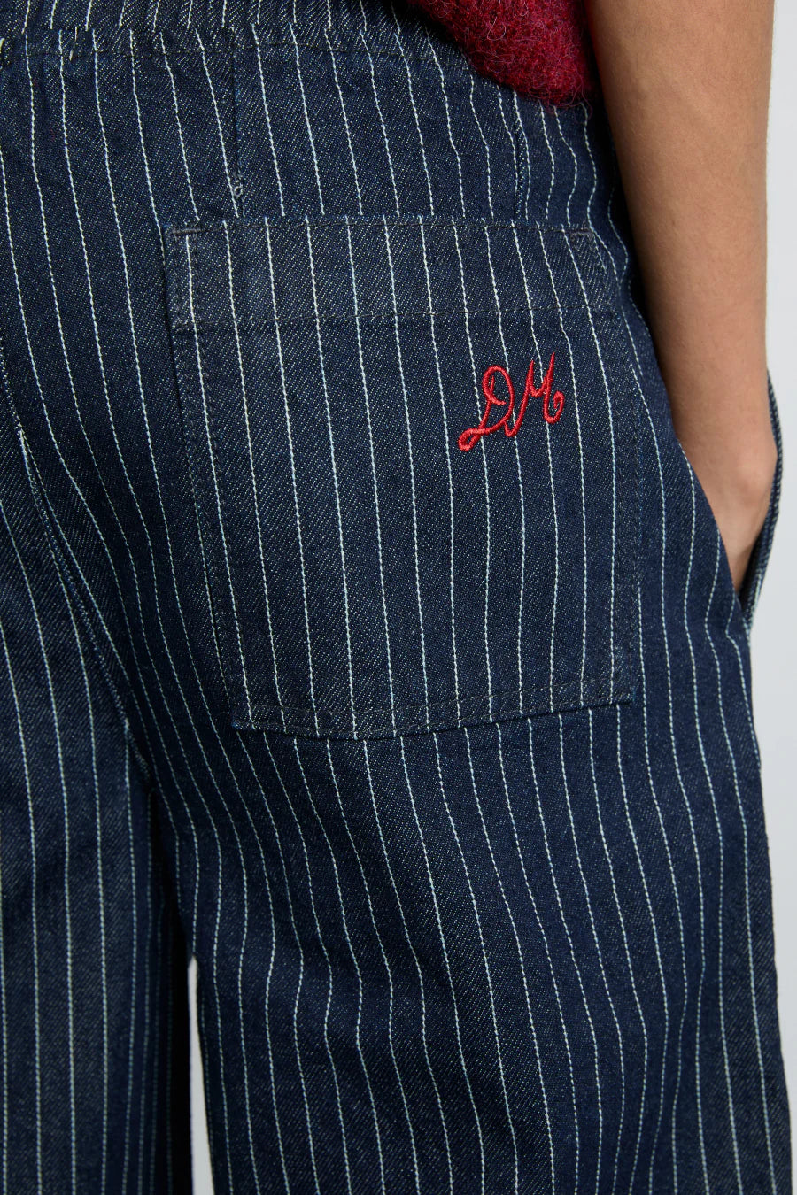 Presenting our Rafe jean. now designed in a navy pinstripe with an added waist tie. Double up on denim and style these with our corresponding Dilly gilet.