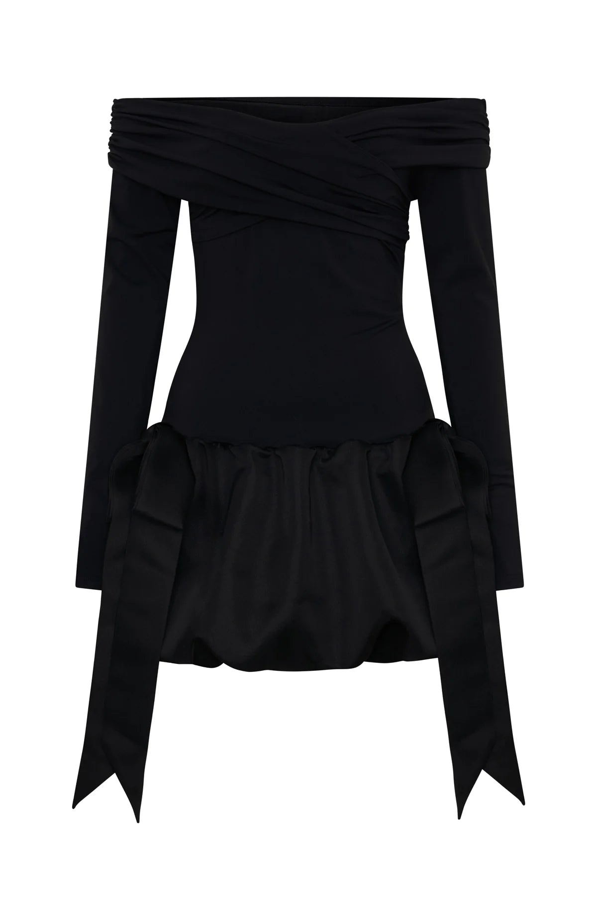 another style within 30 days of receiving your order.Totally sleigh your fit in the Raise Hell Long Sleeve Mini Dress in Black! Features an off-the-shoulder neckline with a chic fold-over detail, elegantly draped over long sleeves. The fitted bodice hugs your shape before falling into a playful drop-waist bubble skirt finished with a statement bow. Fully lined for comfort. Style it with sky-high heels and eye-catching jewellery for your next xmas event.