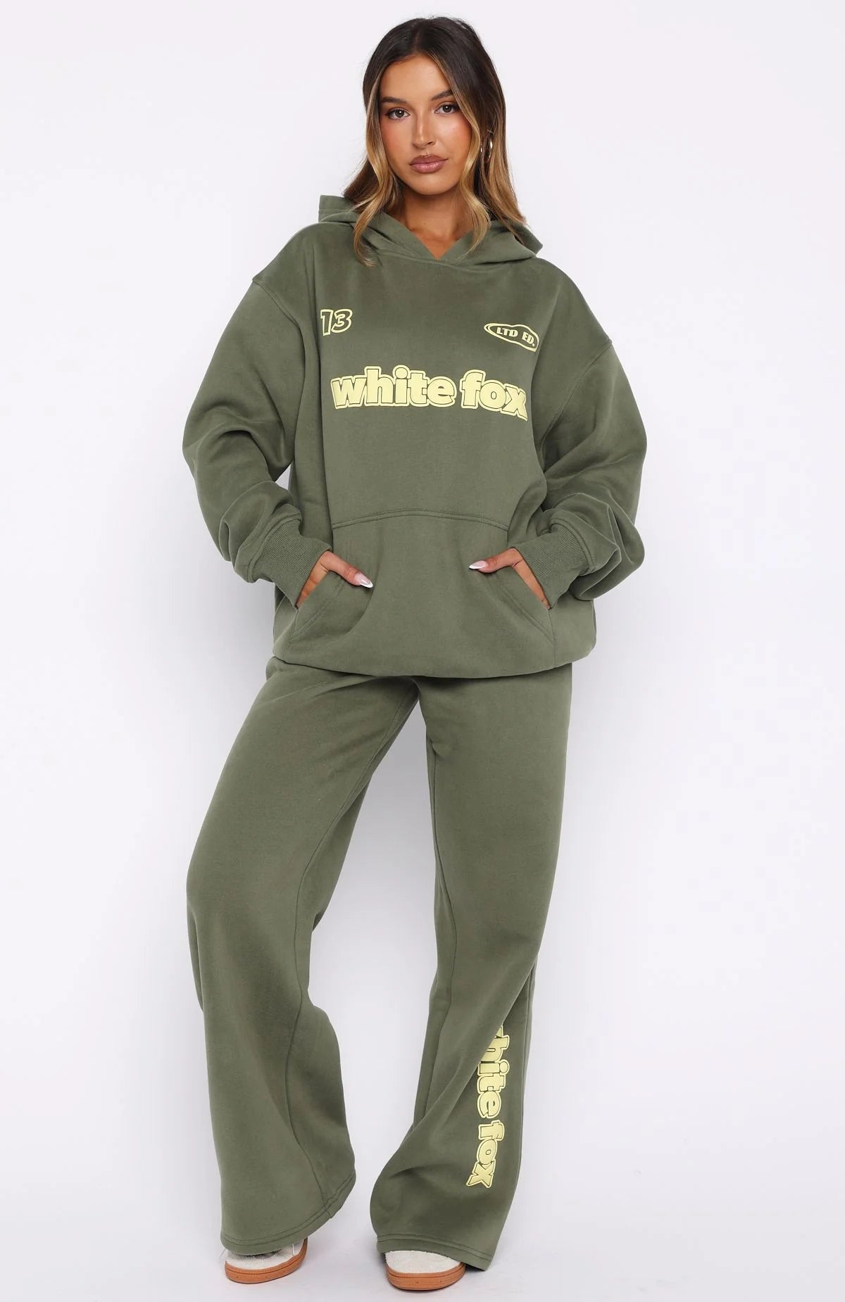 Studying has never looked cuter in the Ready To Go Oversized Hoodie in Khaki! Features a hood, slouched shoulders, long sleeve with ribbed cuffs, ribbed hemline, softest fleece lining and signature puff print White Fox text and graphic centre front. Complete the look with the matching You're Not Allowed Wide Leg Sweatpants Khaki.