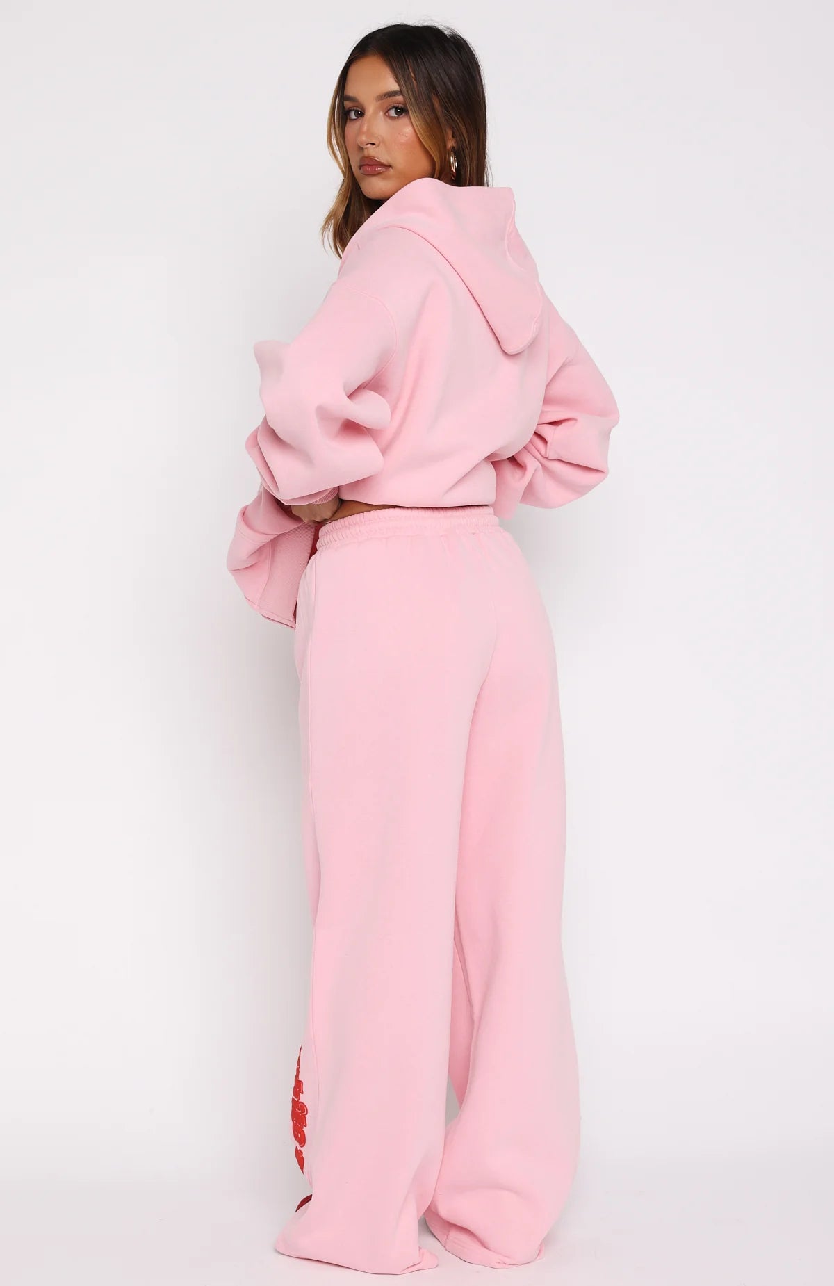 Studying has never looked cuter in the Ready To Go Wide Leg Sweatpants in Pink! Features a thick elasticated waistband with external drawstring tie, wide leg silhouette featuring White Fox puff print text and graphic. Finished off with the softest fleece interior ensuring a cozy feel. Team with the matching Ready To Go Zip Front Hoodie Pink for the comfiest set!