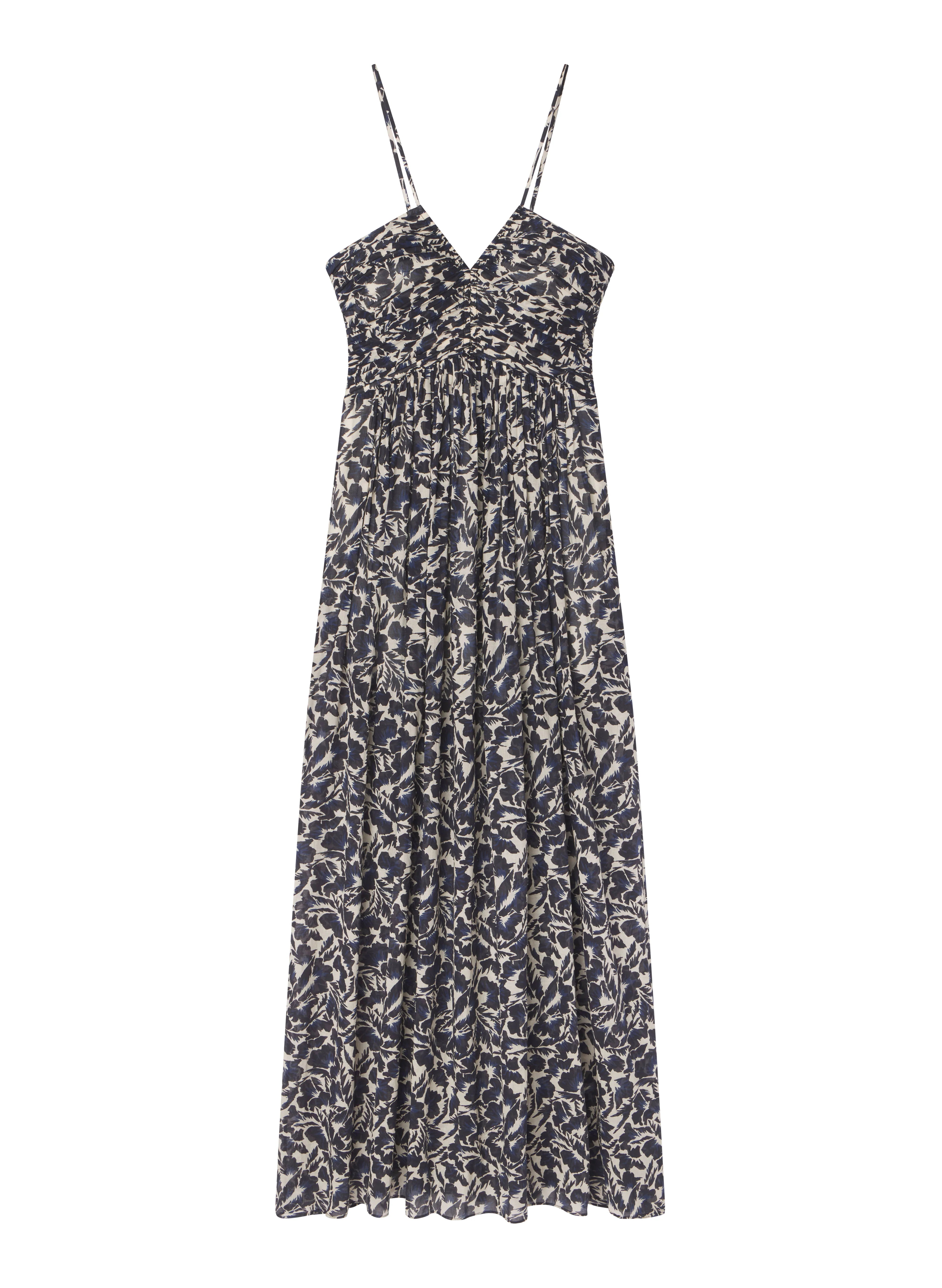 The Romy Dress is crafted from crisp cotton voile in a graphic navy and cream floral print. This maxi dress features thin straps. a V-neckline. and a gathered bodice that gracefully accentuates the silhouette. perfect for warm-weather winter getaways. Shop Dresses.