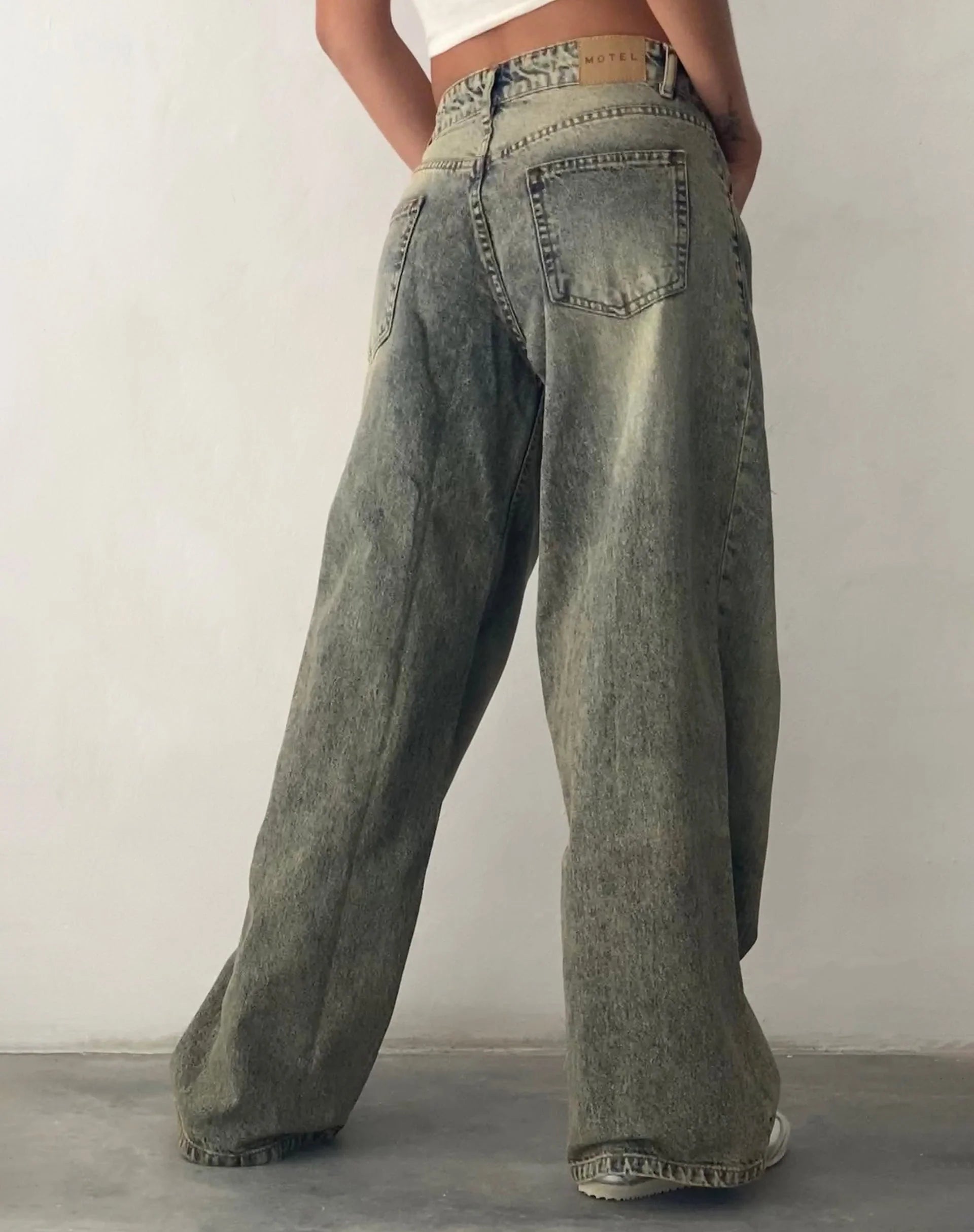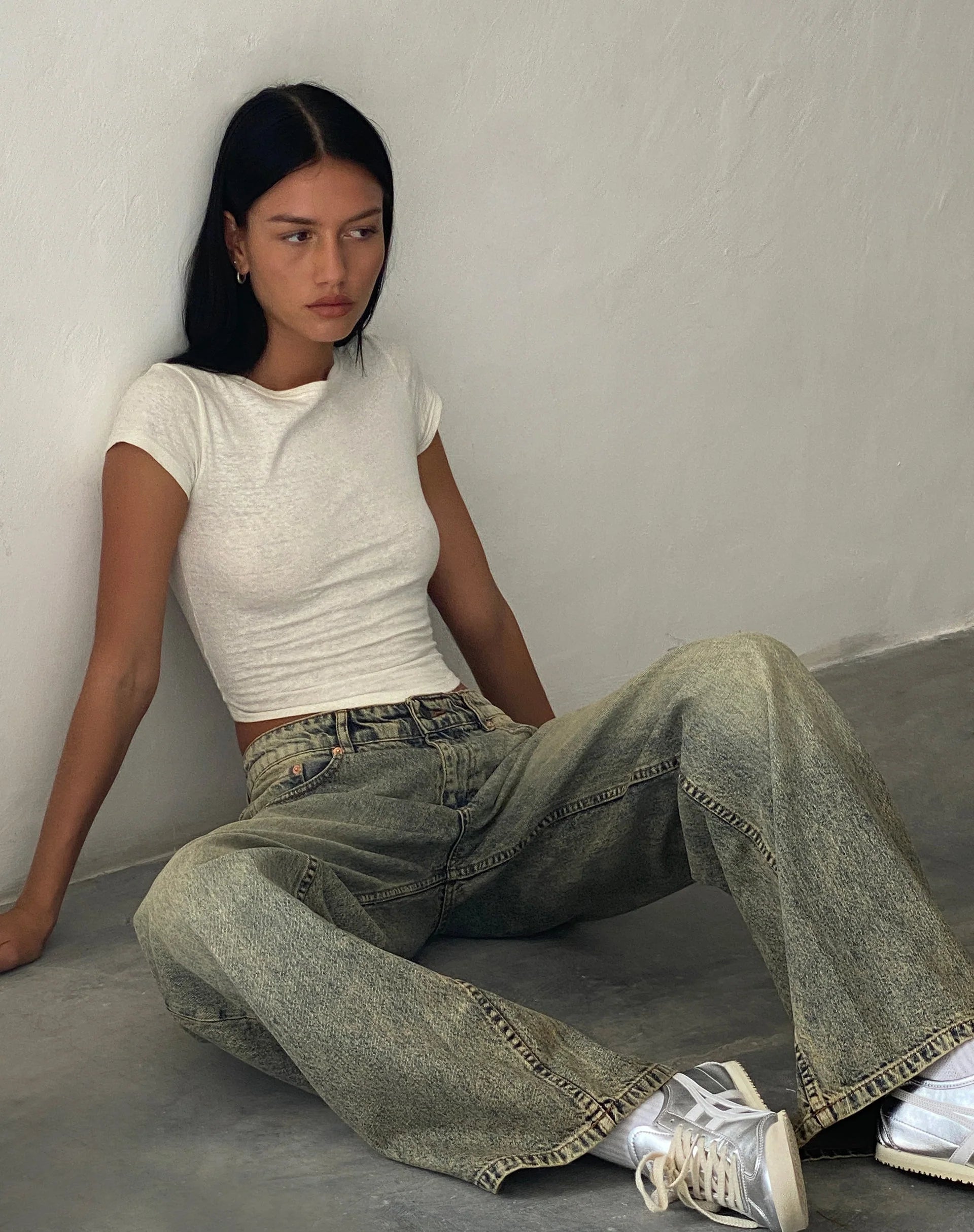 Same style, new colour. The newest addition to the Roomy ~ boasting an oversized, fit and floor-length with a clean hem in a sand wash blue rigid denim. They feature a zip and button fastening and 5 pockets, finished with a branded back tab, button and rivets. Paired with the top.