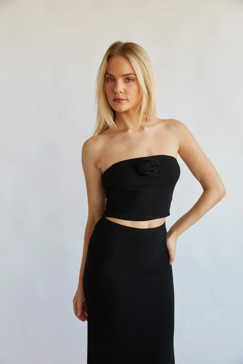 Doesn't get more chic than you in the Rosalyn Rosette Tube Top! This stunning top features a strapless straight-across neckline, cropped fit, and a beautiful rosette detail at the bust. Pair with the matching to complete the set!