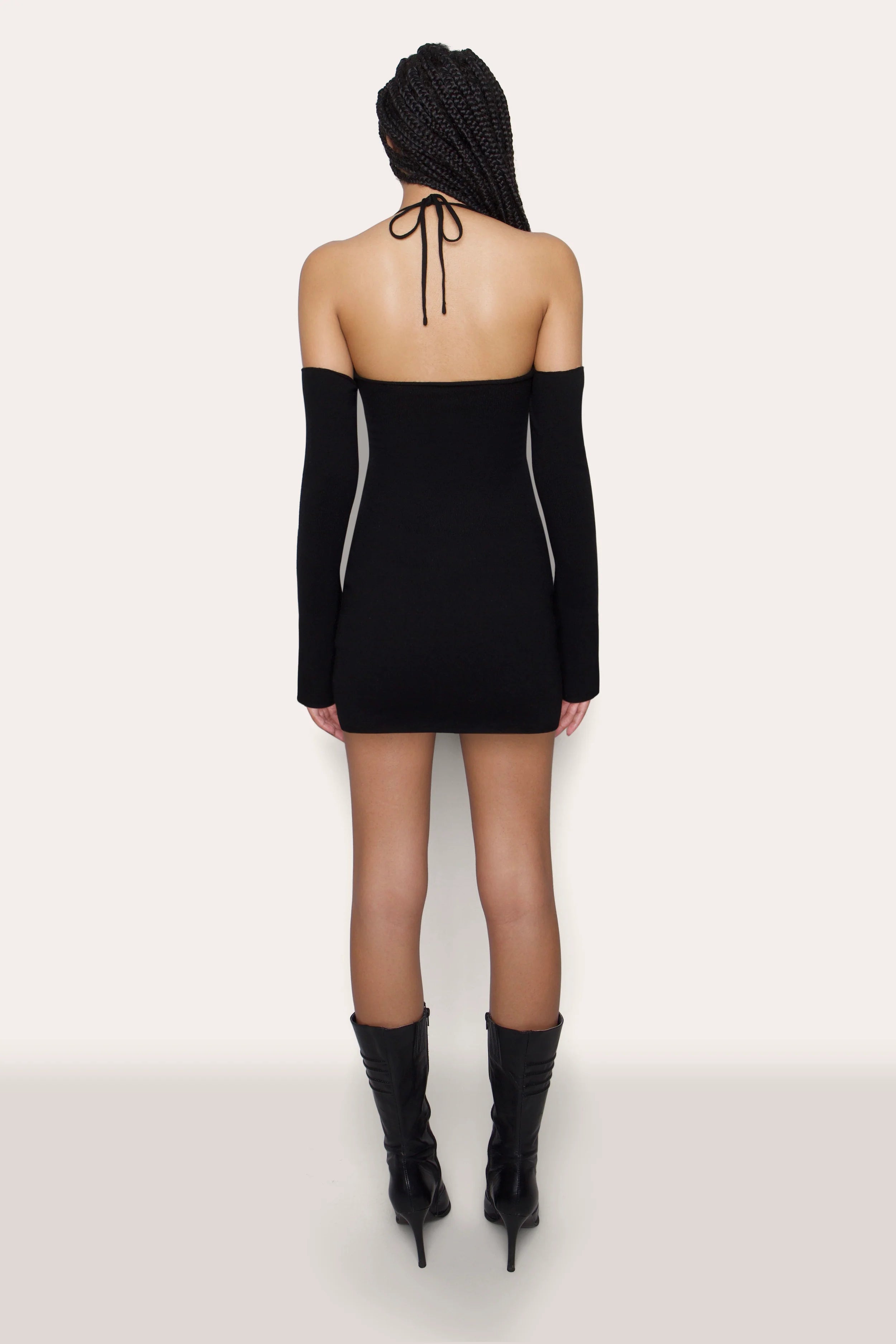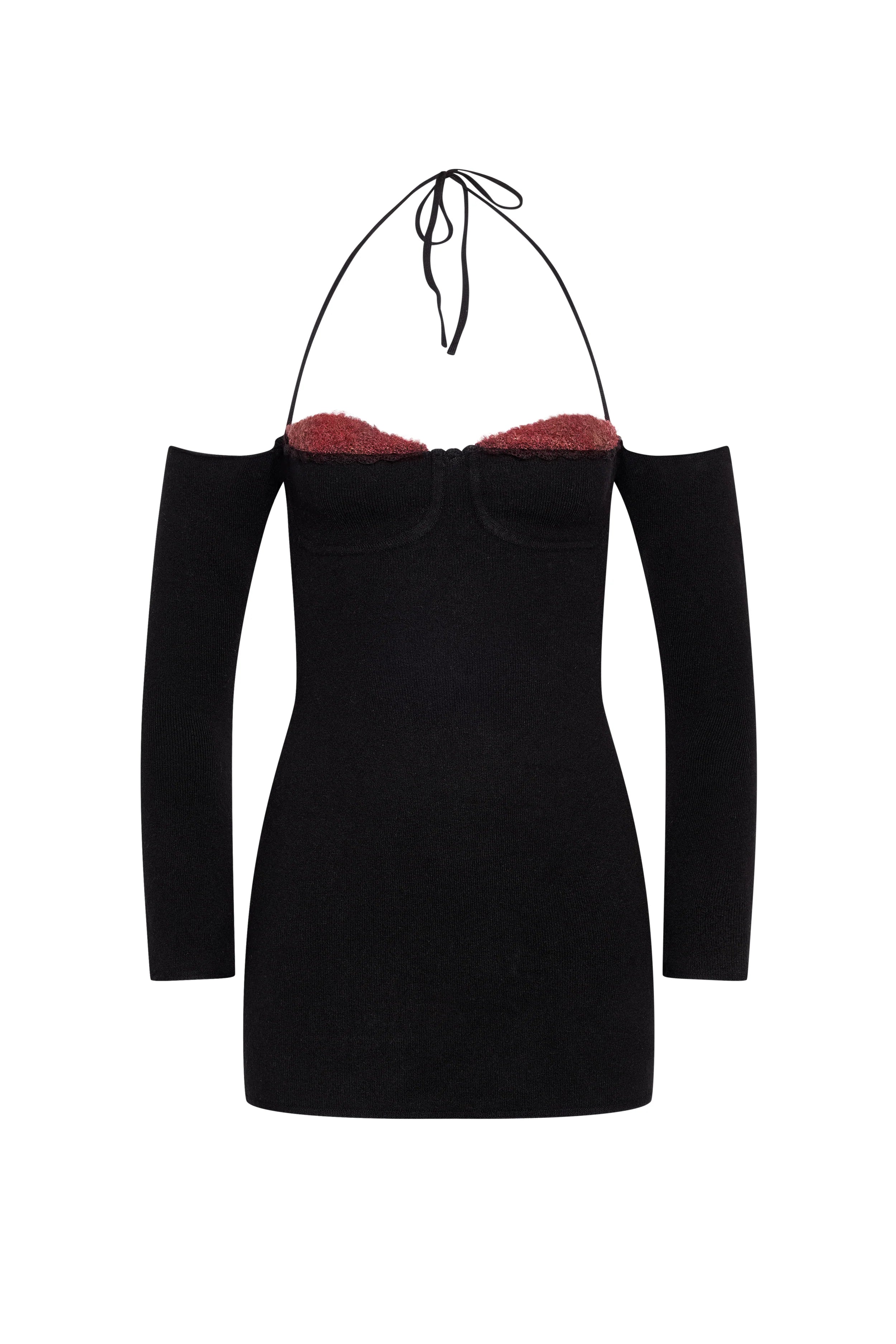 Inspired by the allure and structure of our corsets. meet the Rosemere Knit Mini Dress. Designed with a fitted mini shape. it has an open halter neckline with structured cups for support and drop long sleeves for warmth. We love this style during the colder seasons when we want to be cozy but still want to look super cute – try it with knee-high boots for a cool look.