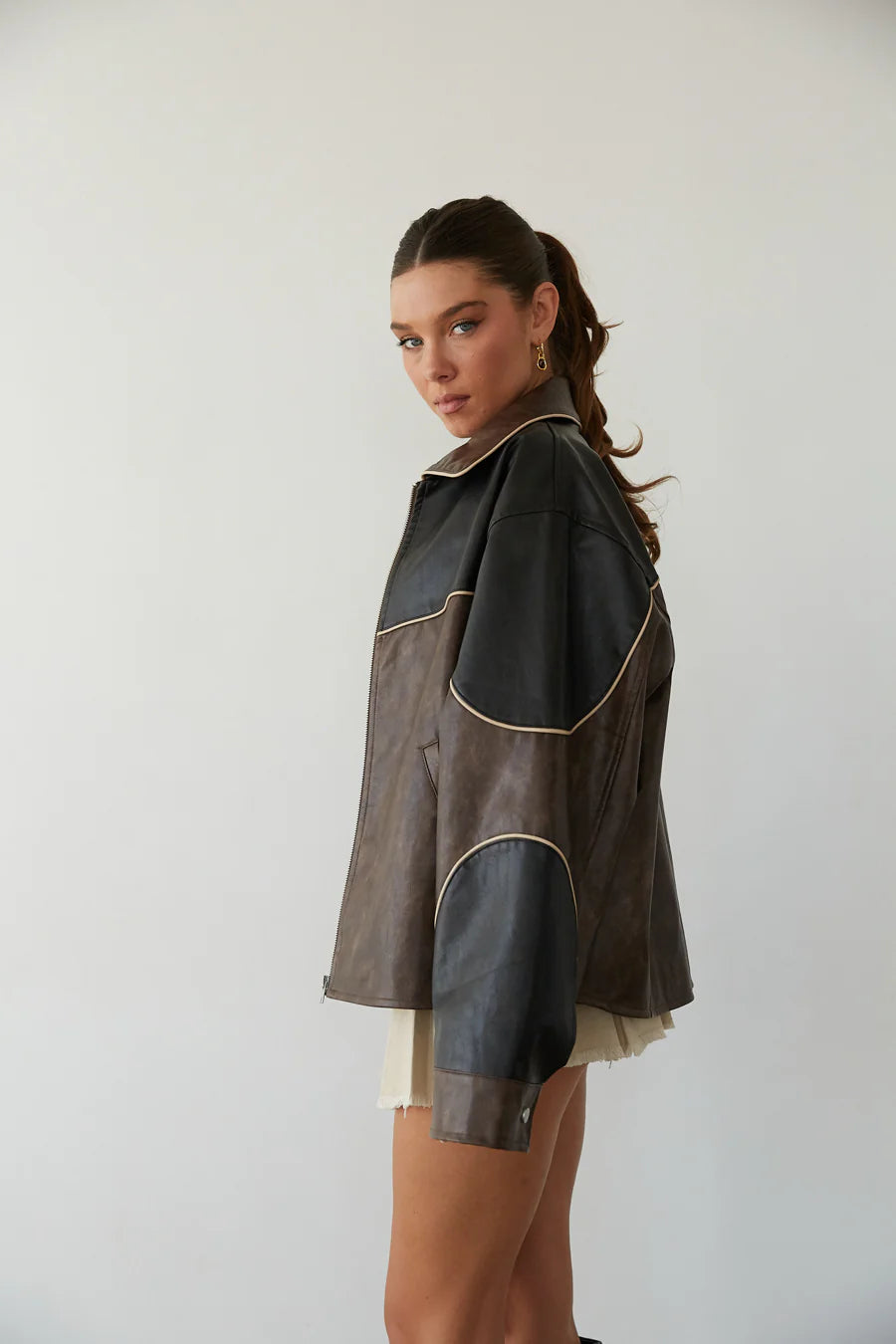 Add some edge to your in the Roxy Faux Leather Bomber Jacket! This trendy jacket features a baggy fit, contrast color blocking color way, and functional pockets! Available in Black + Espresso and black + Beige; pair with a for a spicy take!