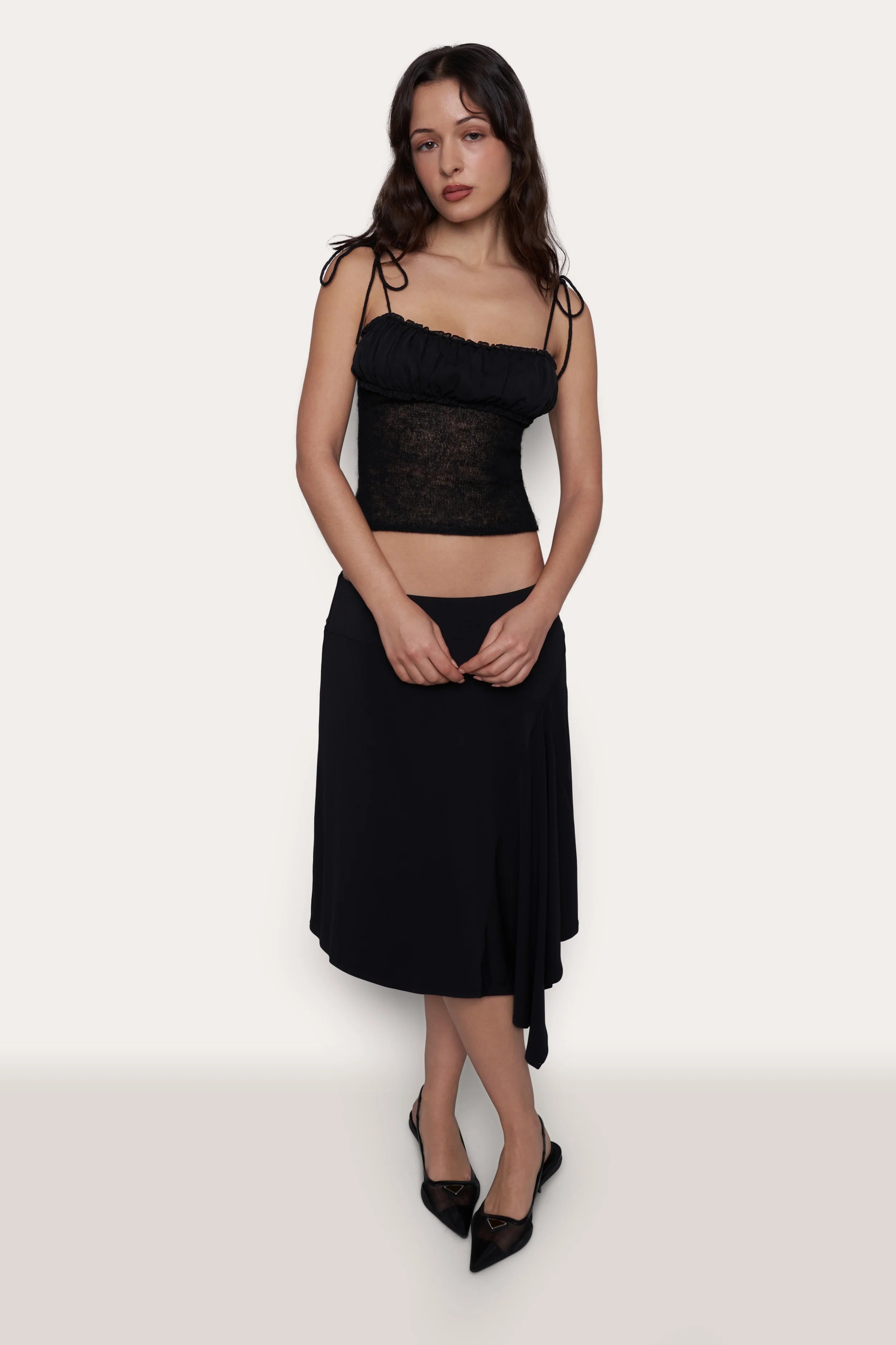 Have you met our Ruched Chiffon Knit Tank? We especially love its hybrid construction – a ruched chiffon bust tops a fuzzy knit mohair bodice for a bit of cozy texture. The charming ruffle trim and tie straps are perfect paired with the Ruched Side-Tie Stretch Pants.