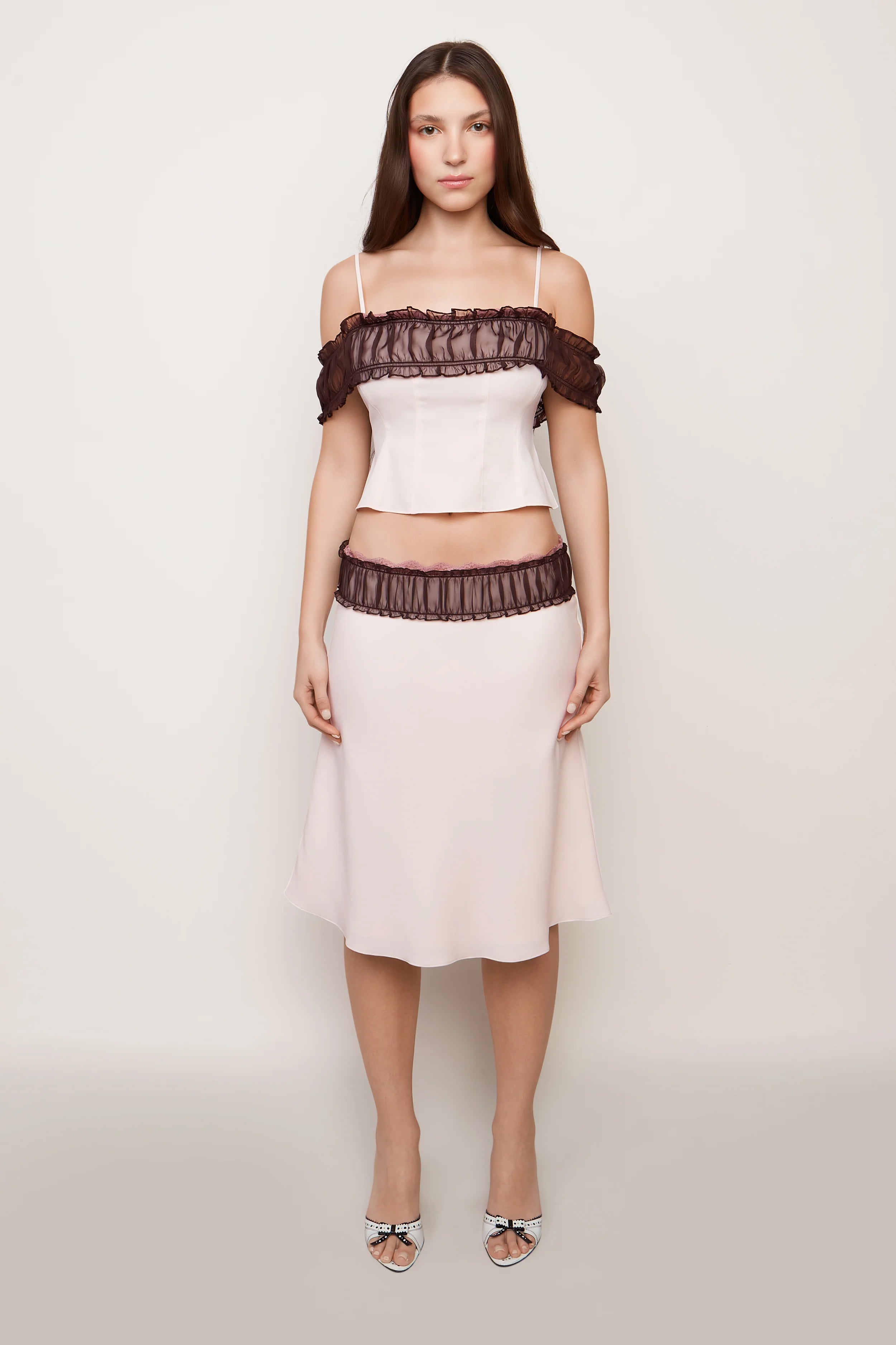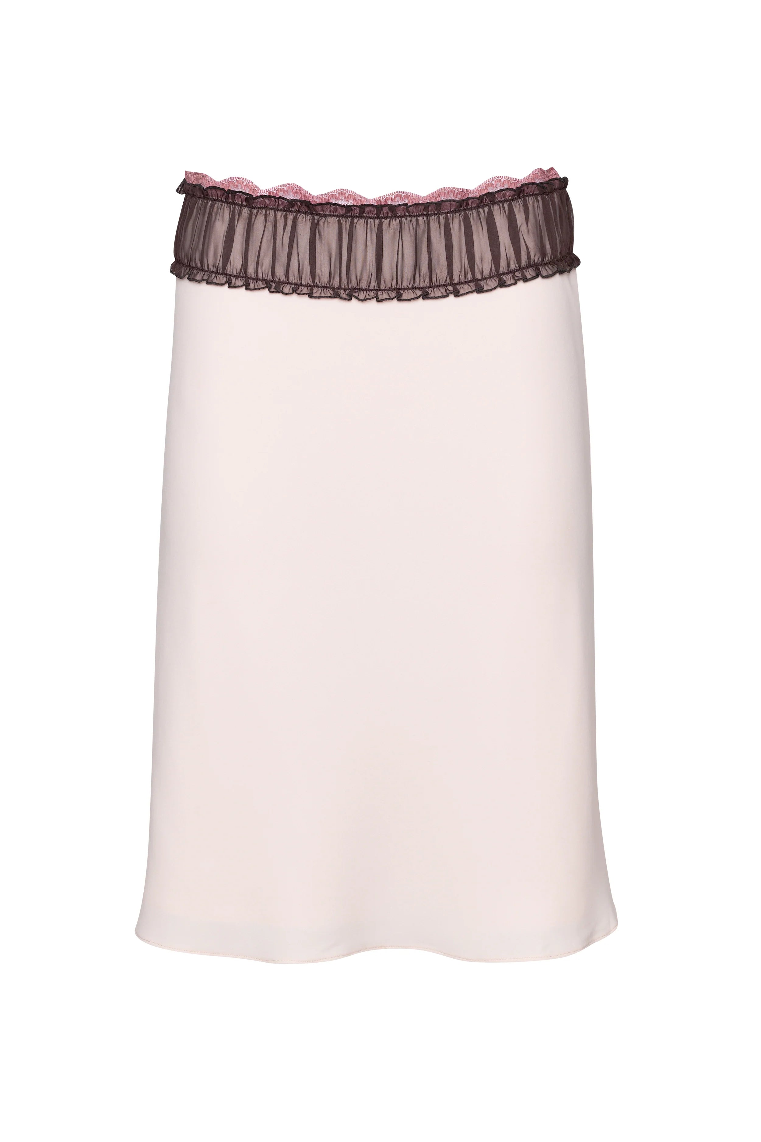 When you need a bit of polish… Meet the Ruched Chiffon Lace Midi Skirt. Baby pink crepe is topped with contrast ruched chiffon and cut to the knee with a bit of flare. Wear it with the matching Ruched Chiffon Lace Tank.