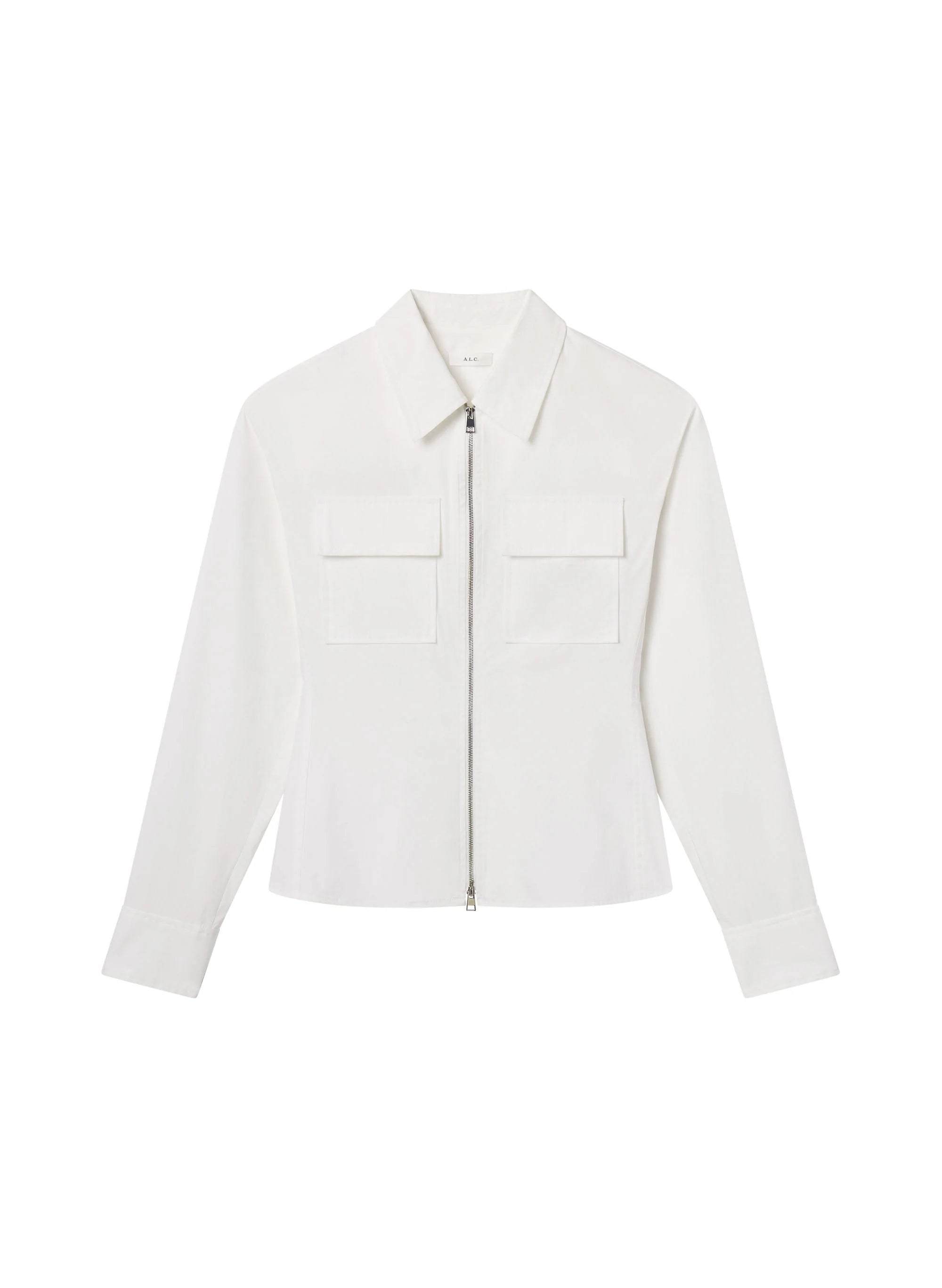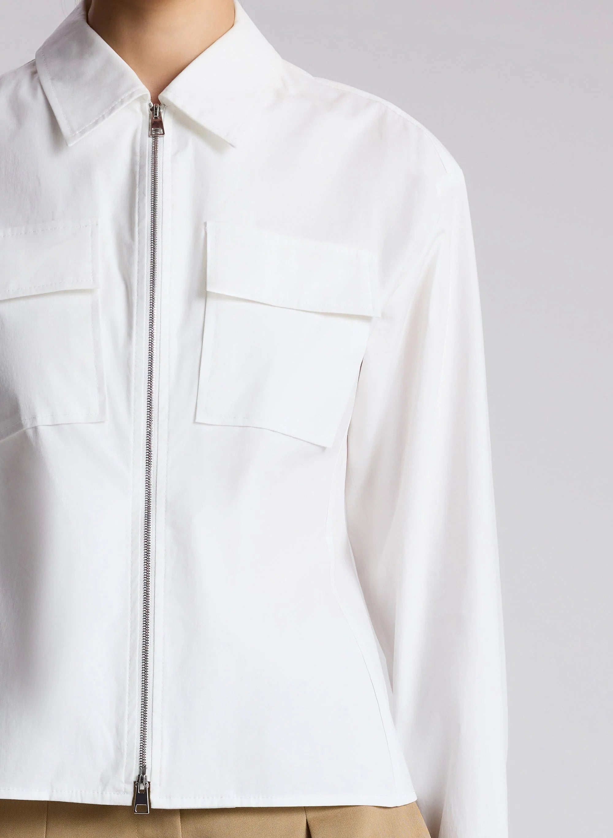 The Sage Top is crafted from a light refined cotton in classic white. This long-sleeve silhouette features a collared neckline with a front-zip closure and two breast pockets. This style runs true to size. Shop Tops.