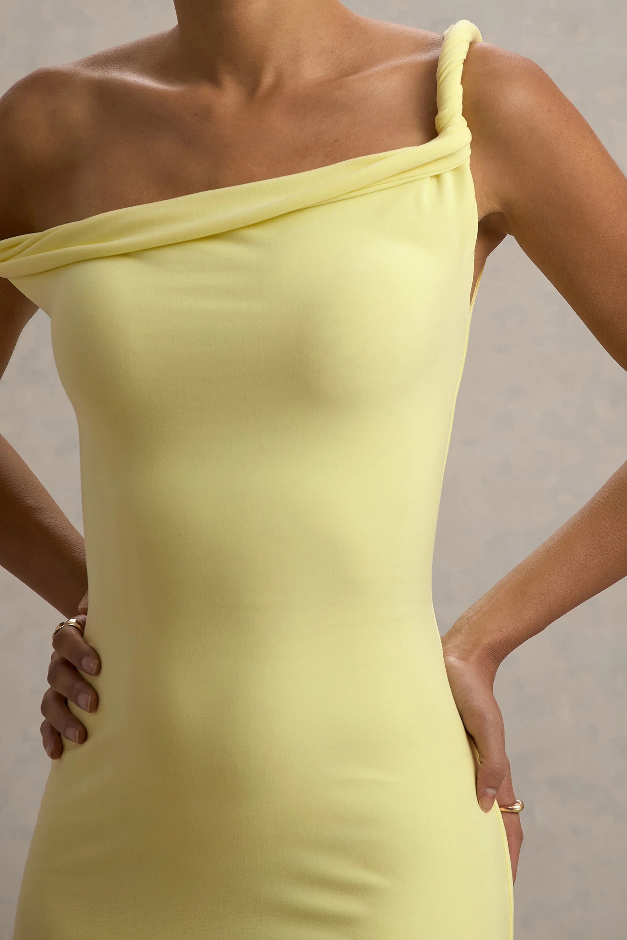 Minimalistic with a twist, say hello to Salome. This midi dress in lemon has been crafted in our premium brushed jersey for figure-flattering comfort. Detailed with an asymmetric twisted neckline for a new season shape, keep Salome at the forefront with a sleek updo and gold accents.